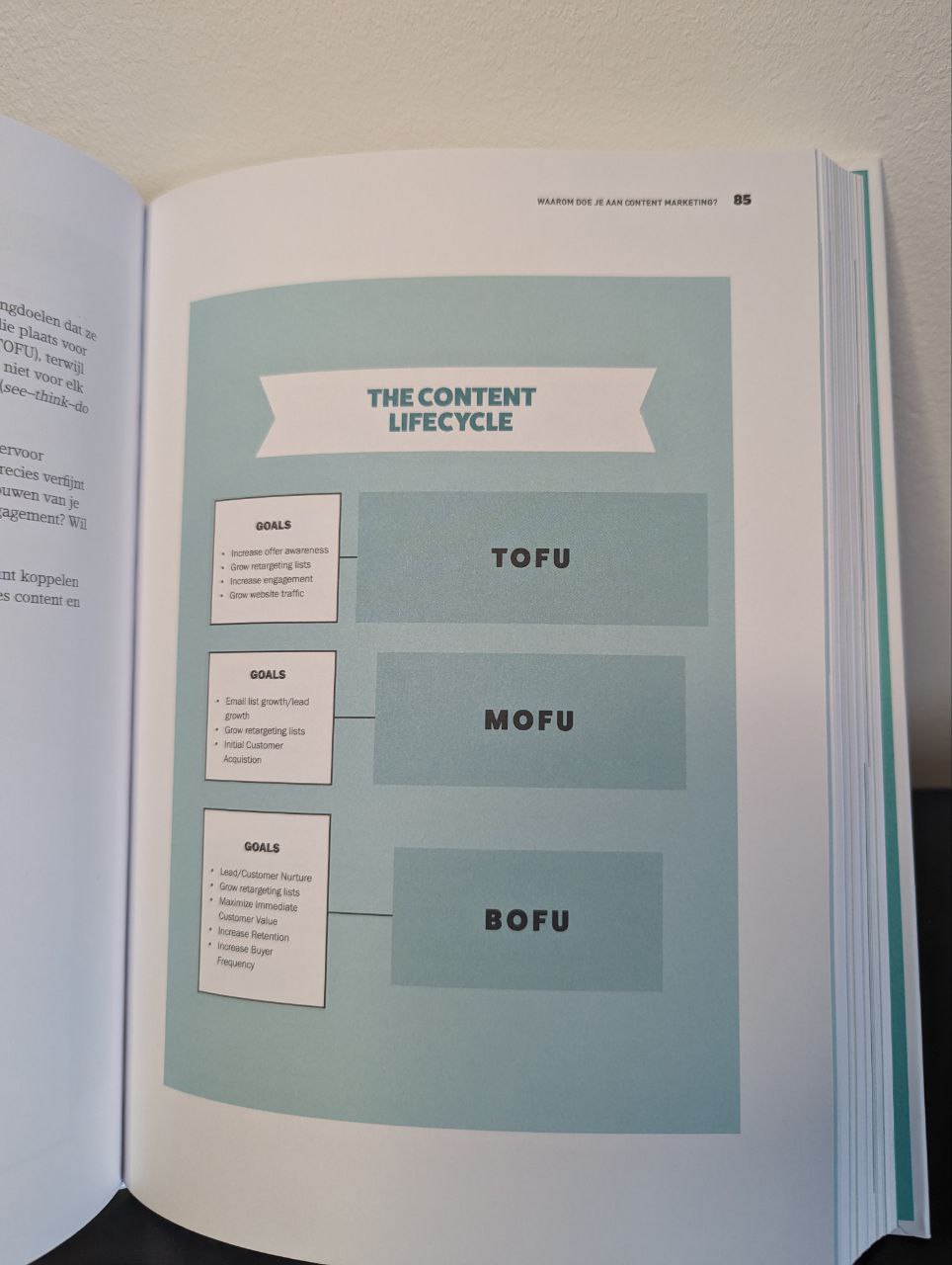 Op bovenstaande fotos zie je voorbeelden van het frisse, rustige design door het boek heen. Ook kun je zien dat er verschillende voorbeelden en media worden gebruikt. The content lifecycle, zoals op de middelste foto, komt regelmatig terug doorheen het boek. Deze bestaat uit TOFU, MOFU en BOFU en helpt bij het mappen van verschillende onderdelen van je marketingfunnel. Klinkt dit onduidelijk? Het is enorm simpel als je het leest of je er in verdiept en is een leuk voorbeeld van de tools die Dit is content marketing te bieden heeft.