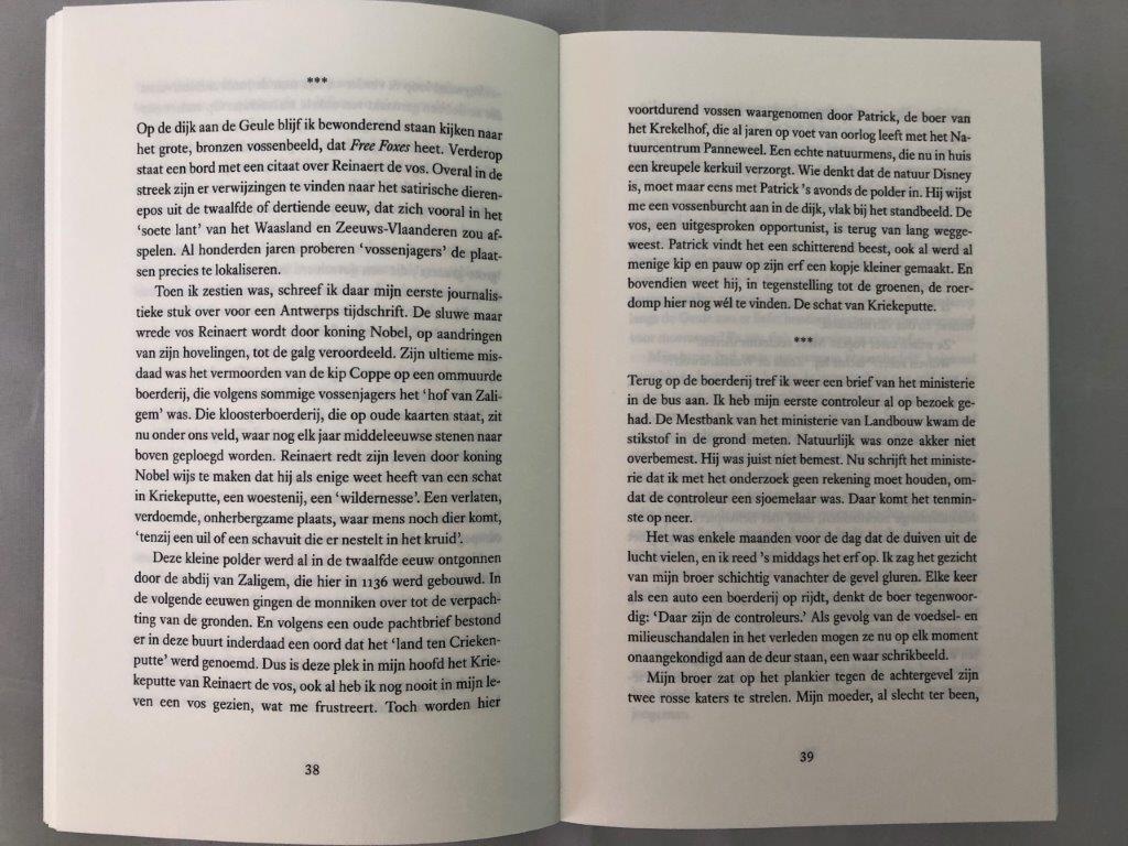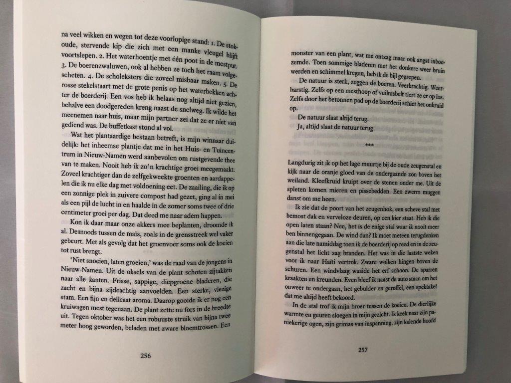 Wat een prachtig boek is dit. Helder, bijna poëtisch geschreven. Bijvoorbeeld het stuk waarin hij aangeeft wat het is om boer te zijn: “Het raakte de kern van ons wezen. Dit was wat zij kenden, waar zij dag en nacht mee waren begaan. De omgang met de cyclus van geboorte, leven en dood, gaf zin en ritme aan hun wereld. De strijd om het bestaan, een strijd met de natuur vaak, verbond verleden en toekomst”. En daarna in de Epiloog de pijn die Chris de Stoop voelt omdat het bij hem gaat eindigen: “Ik zie de tijd die komen gaat. ik, van beide kanten afkomstig uit grote boerengeslachten, moet een einde maken aan de eeuwenoude ketting van het boerenleven, terwijl boeren voor ons altijd even vanzelfsprekend was als het hebben van een moeder. Ik ben niet eens de laatste schakel van de ketting. ik ben de tang die ze doorknipt”.