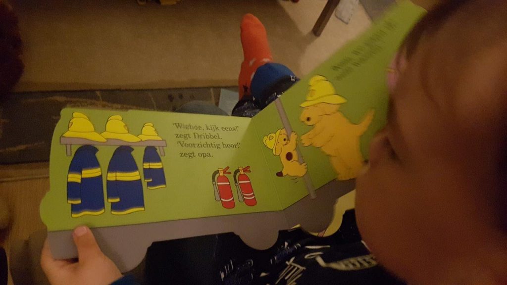 Wat mij betreft niet geschikt om voor het slapen gaan te lezen dus, want mijn zoontje was haast niet meer te stoppen met het indrukken van het knopje. Een ander boekje wilde hij daarna eigenlijk niet meer lezen en wilde het liefst weer gaan spelen. Ik denk dat ik Dribbels brandweerauto in de doos met zijn autootjes ga bewaren in plaats van in zijn boekenkast die naast zijn bed staat…