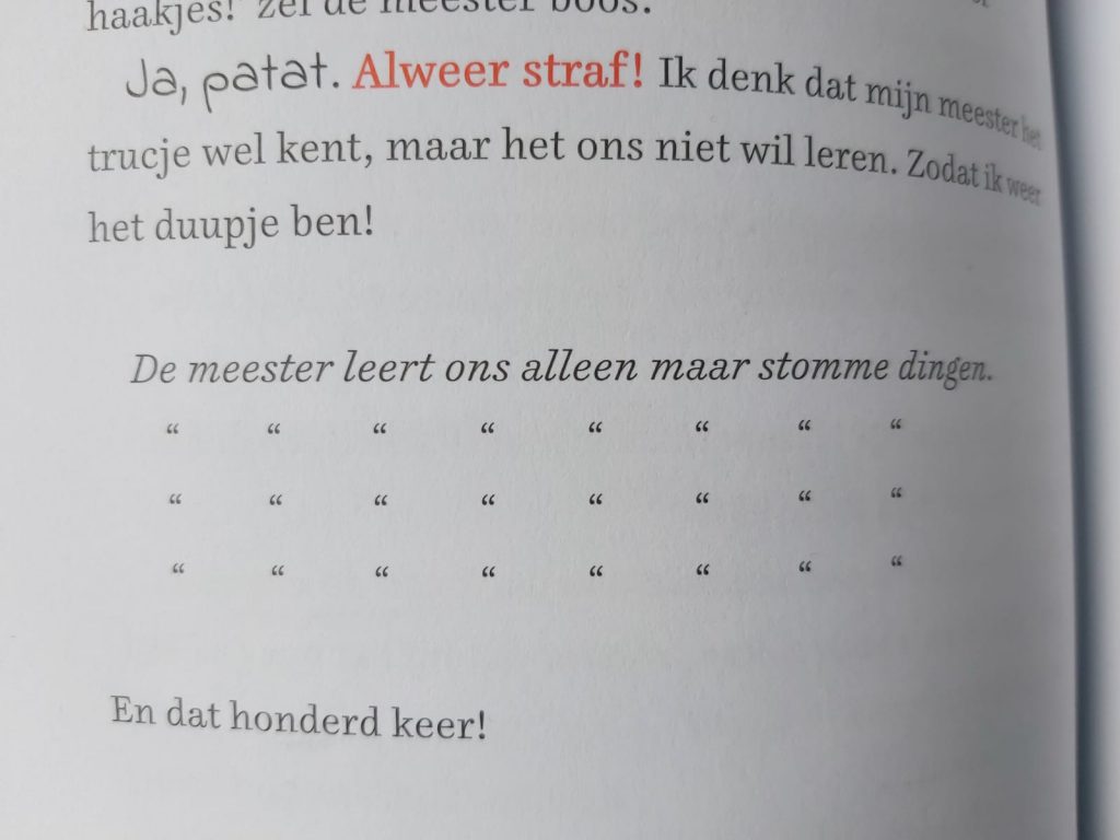 Heb je geen zin om te lachen? Dan moet je dit boekje zeker niet lezen of voorlezen aan je kinderen. Per hoofdstuk heb je wel 3 of zelfs 4 keer gelachen en dat doet wat met je lachspieren. Duupje is zo herkenbaar en grappig. Door de dingen die hij doet is hij altijd “het Duupje”. Wij zouden zeggen dat hij altijd de sjaak is. Maar dat maakt niet uit, want dit boek blijft ontzettend grappig en bovendien herkenbaar voor kinderen. Ook groep 7, ik heb een stukje in de klas voorgelezen, moest heel erg lachen.