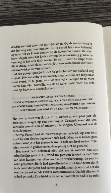 Ik leer al snel Fiona kennen, een wat oudere vrouw die door reorganisatie haar baan op een camping in Zeeland is kwijtgeraakt. Dan ziet ze ineens een advertentie van een camping in Frankrijk. Ze zoeken een assistent manager en Fiona zoekt een nieuwe uitdaging. Fiona woont en werkt in Zeeland en Frankrijk is niet meteen dicht bij de deur. Maar toch neemt ze de gok en vertrekt ze naar Frankrijk. Gaat haar jarenlange ervaring haar helpen, ondanks dat ze de taal niet echt goed beheerst? En zal ze het naar haar zin hebben, zo ver weg van haar vriendinnen en haar dochter? Haar man mist ze iedere dag omdat hij is overleden. Zonder hem is het leven toch anders en nu ook haar baan haar niet meer in Nederland houdt, waagt ze toch de gok.