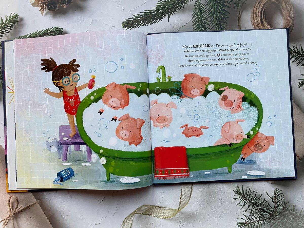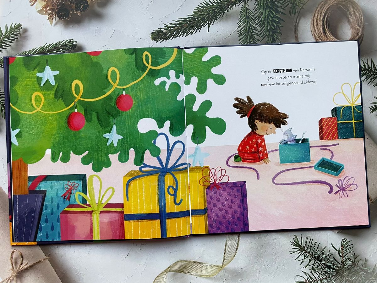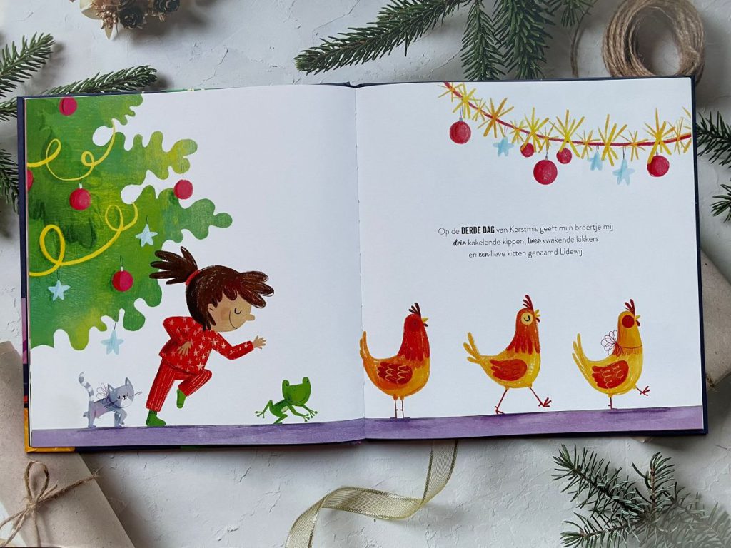 Jippie, het is kerst! Eén meisje krijgt een heel bijzonder cadeau: elke dag een nieuw huisdier. Het begint met één kitten op dag één, twee kikkers op dag twee, en drie kippen op dag drie… En zo gaat dat twaalf dagen door. Maar als er zelfs apen, varkens en leeuwen gegeven worden, wordt het misschien niet zo gezellig meer in huis? In dit boek tref je een gezellige beestenboel aan!