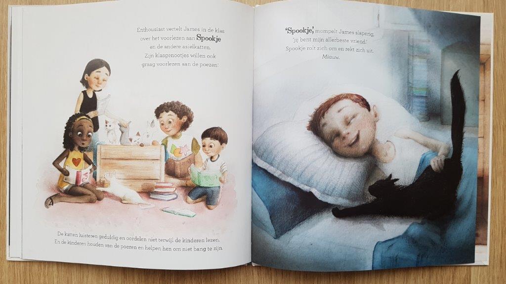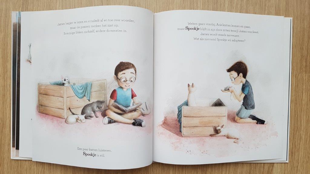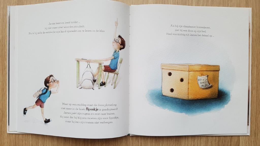 James blijft net zo lang doorlezen totdat hij niet meer over woorden struikelt. En… hij zelfs als eerste zijn hand opsteekt in de klas om als eerste te mogen lezen! Wanneer hij op een dag weer een boek voor wil lezen aan de poes in het asiel, blijkt de doos ineens weg te zijn. Spookje is geadopteerd… James is verdrietig, maar ook blij voor Spookje. Maar zijn geluk kan niet meer stuk wanneer hij thuiskomt en daar ineens de doos ziet staan!
