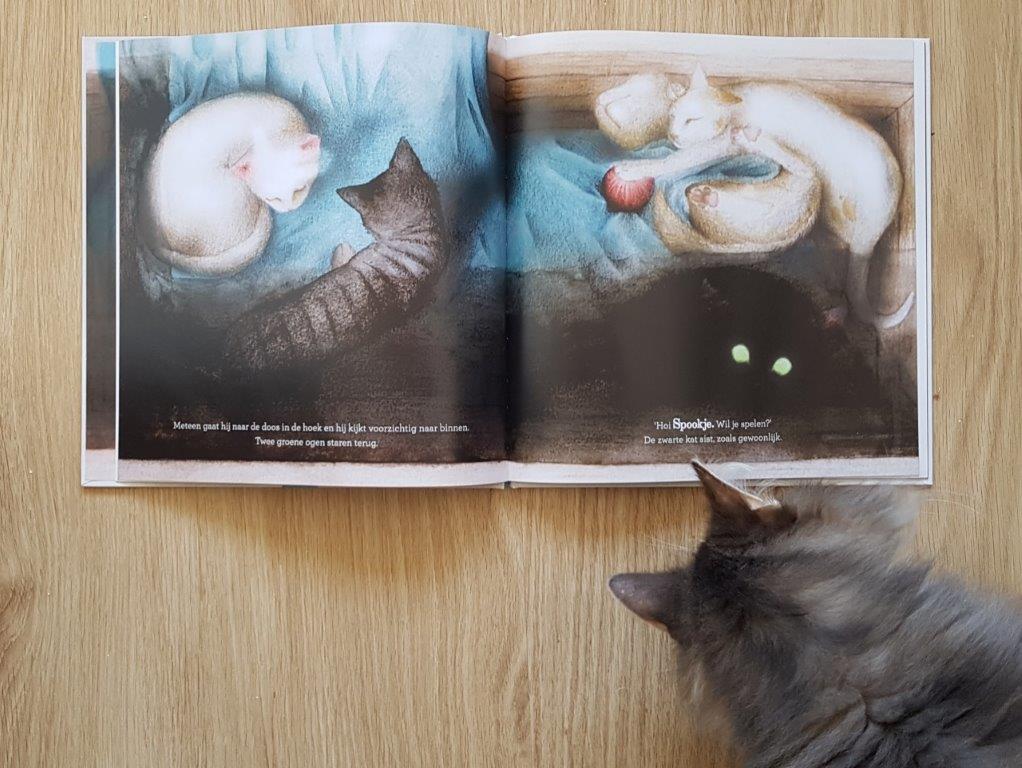 Hoera, onze katten Murdock en Nina zijn jarig! En hoe leuk is het dan om samen met mijn zoontje Een boek voor poes cadeau te geven aan ze! Het inpakken was al een feestje samen. Het papier werd door mijn zoontje uitgekozen. En met veel liefde pakte hij het zorgvuldig in. Dat het papier net iets te kort geknipt was, dat gaf niets, daar plakte hij gewoon een ander stuk papier overheen met nóg meer half verkreukelde stukjes plakband. Daarna hielp hij de katten met het uitpakken van hun cadeautje. We gingen op de grond zitten in hun kamertje en lazen samen het boek aan ze voor, maar poes Nina was vooral geïnteresseerd in de prop papier naast ons.