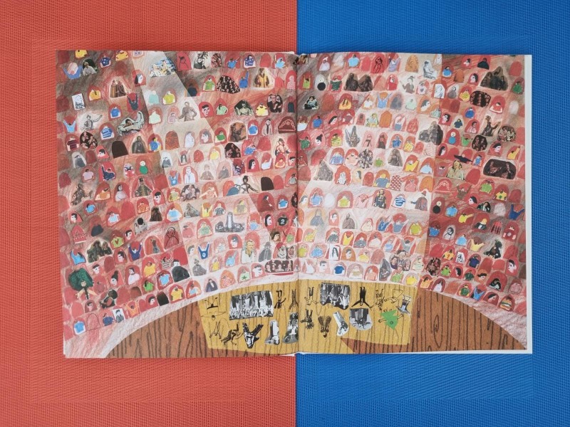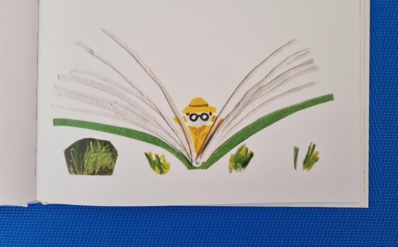Als je het boek openslaat zie je een bladzijde vol strepen. Daartussen zie je een blauw vlaggetje, of is het toch een staart? Of een leeswijzer? Dit zullen we nooit weten. Deze verwarring kun je steeds vaker opdoen als je de bijzondere illustraties bekijkt. Je ziet uitgeknipte plaatjes, tekeningen met potlood en/of krijt, pentekeningen foto’s. Van alles en nog wat komt er namelijk voorbij in de kijkplaten. Dat kun je dan ook lang doen naar deze bladzijdes, kijken!