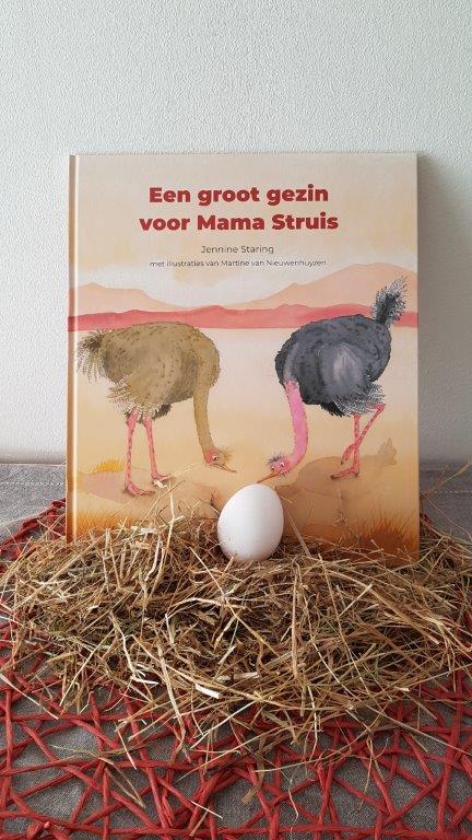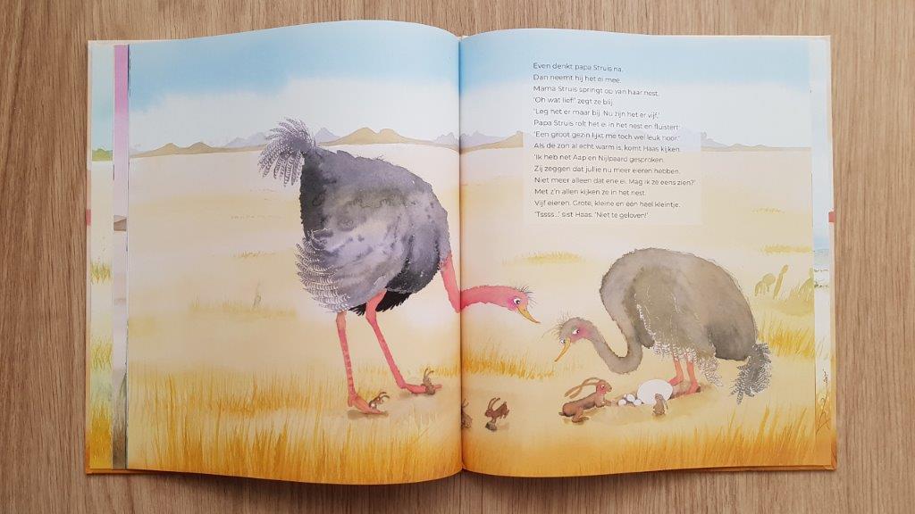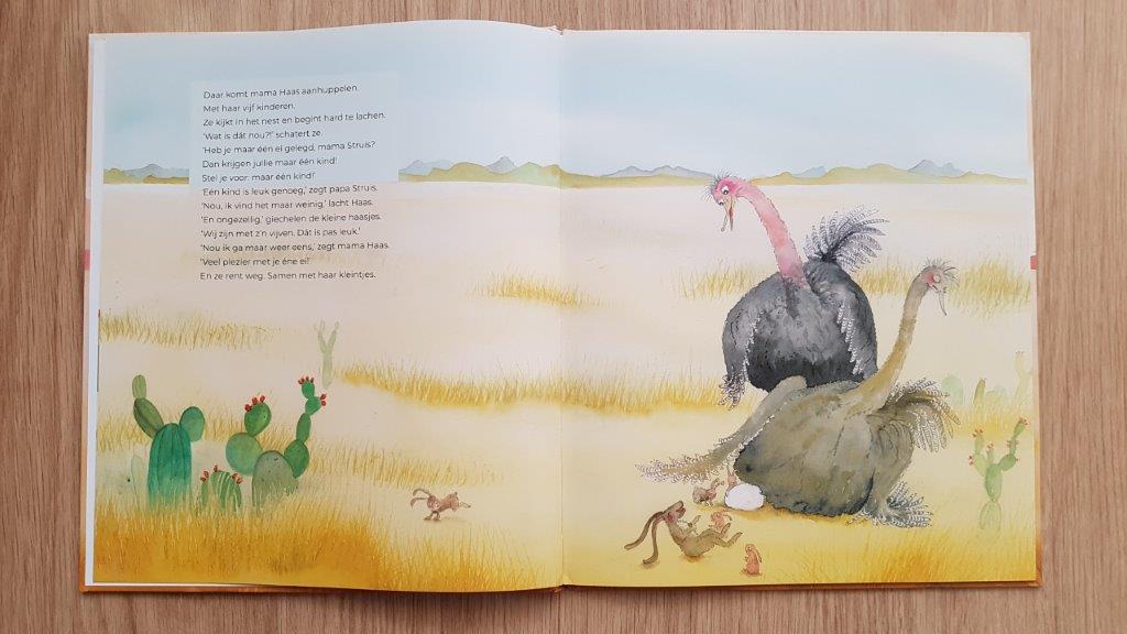 Oh en de illustraties in ‘Een groot gezin voor Mama Struis’ zijn stuk voor stuk prachtig. Het leuke is, dat op elke pagina waar een ei gevonden wordt, ook het dier dat erin zit in datzelfde ‘schilderijtje’ te vinden is. En de plaatjes van ei naar struisvogel op de rug van de omslag van het boek maken het helemaal af!