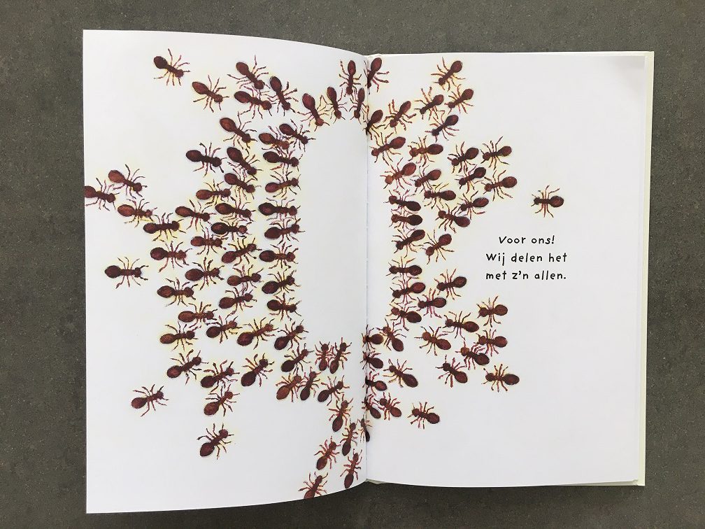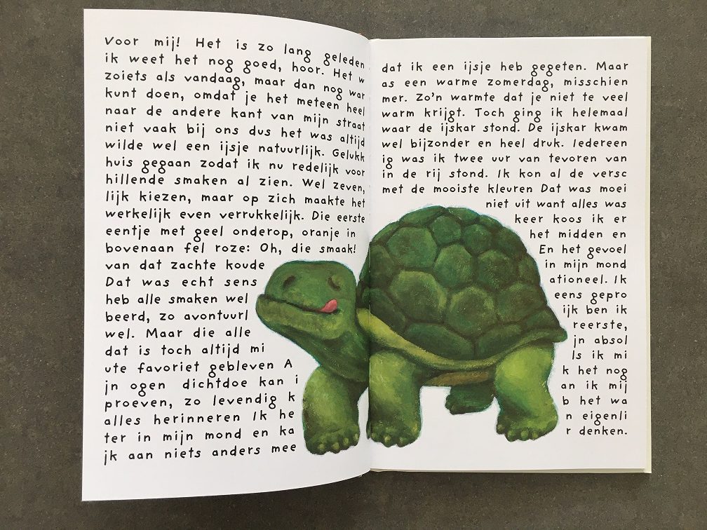 Het eerste wat aan dit boek opvalt, is dus de mooie voorkant met de uitsnede van een ijsje. Ook is het formaat opvallend. De meeste prentenboeken hebben een wat groter formaat, dit boek is net een slag kleiner. Dat maakt het meteen een heel handzaam formaat voor peuters en kleuters.