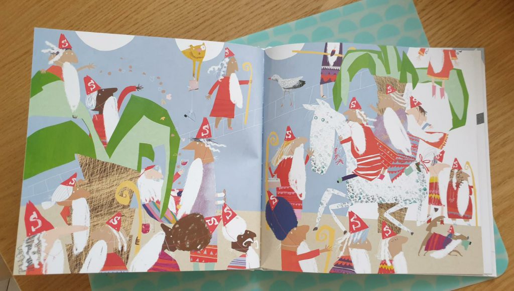 En wat een diversiteit aan hulpsinterklazen is er gekleurd in dit prentenboek een schip vol sinterklazen. Zelfs een persoon in regenboogkleding! Meisjes, jongens, allerlei huidskleuren en zelfs een hond is aangenomen als hulpsinterklaas. Wat ik heel fijn vind in dit prentenboek is dat er ook 2 pagina’s zonder tekst zijn. Dat geeft nog meer ruimte voor interactie met de kinderen. Wie denk jij dat er een goede hulpsinterklaas zal zijn? Mogen meisjes ook Sinterklaas zijn? Waarom wel waarom niet?