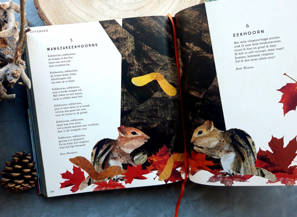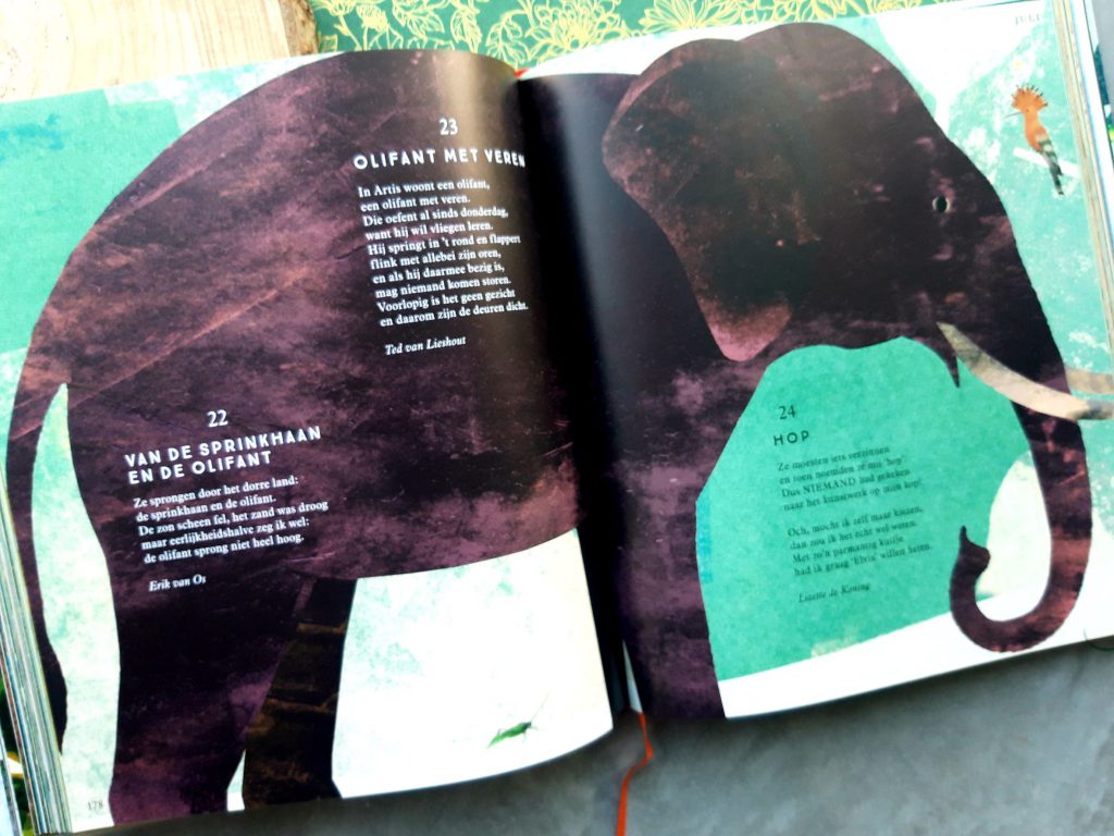 Wat zijn alle gedichten mooi bij elkaar verzameld in deze bundel samengesteld door Uitgeverij Ploegsma. Maar ook de illustraties maken het een parel van een boek. Op iedere pagina zien we een grote en kleurrijke illustratie die perfect past bij het thema van de gedichten. Prachtig gedaan door Britta Teckentrup. Zij is een prijswinnende illustrator en auteur, afkomstig uit Duitsland. Wij kennen haar bijvoorbeeld ook van het mooie prentenboek In de maneschijn.