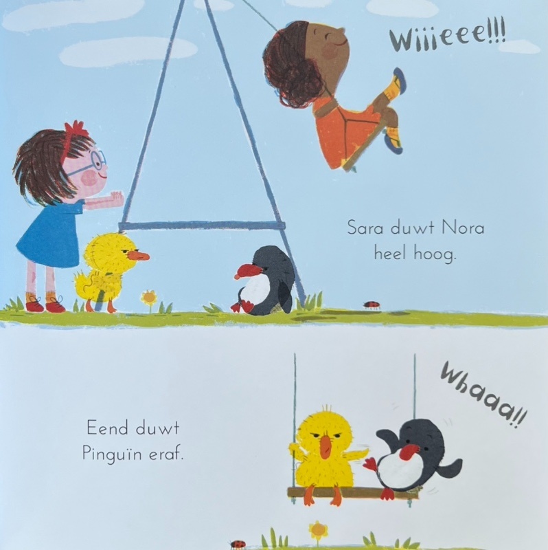 In Eend en Pinguïn zijn geen vrienden gaat het over de vriendschap tussen Sara en Nora. Zij hebben allebei een lievelingsknuffel en nemen die overal mee naar toe. De twee meiden vinden het erg leuk om beide knuffels overal bij te betrekken. Als zij gaan koken, doen de knuffels mee. Zodra zij gaan spelen in de speeltuin, zitten de knuffels ook op een speeltoestel en zo gaat dat met alle activiteiten.