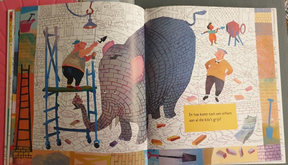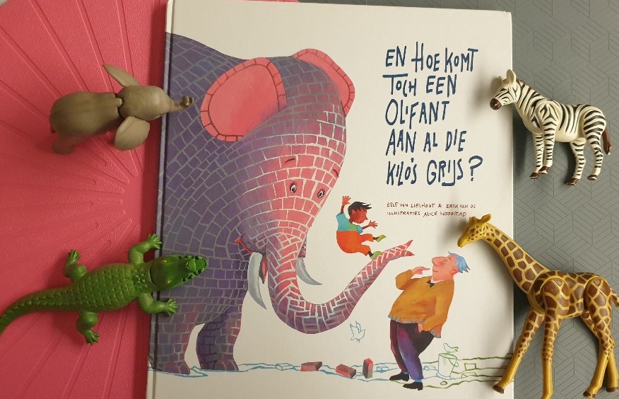 Het antwoord op de vraag: En hoe komt toch een olifant aan al die kilo’s grijs? vinden we in elk geval niet in dit prentenboek. Maar dit boek is niet met slechts 1 doel leesbaar. Anders zou hij ook niet voorkomen in het mooie boek: Met rekenogen bekeken met rekenactiviteiten voor jonge kinderen.