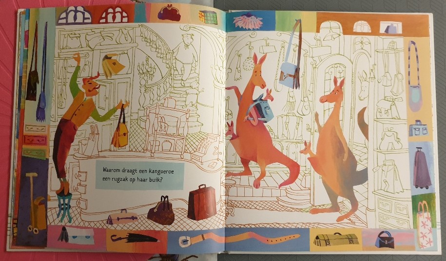 Maar hij wil ook weten waarom een zebra nooit eens roze met blauw gestreept is. En wie zet al die ogen in de veren van een pauw. Van elk dier heeft hij wel een vraag, en eerlijk is eerlijk ik weet de antwoorden ook niet!