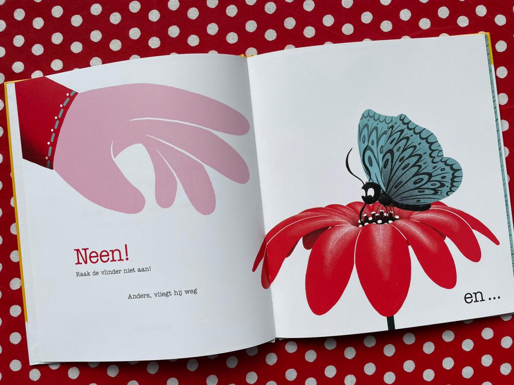 ‘En …’ is een stapelverhaal. Het begint met een hele simpele handeling. Een kindje wil een vlinder aanraken, die op een bloem zit. Maar daar wordt voor gewaarschuwd: ‘Neen! Raak de vlinder niet aan!’