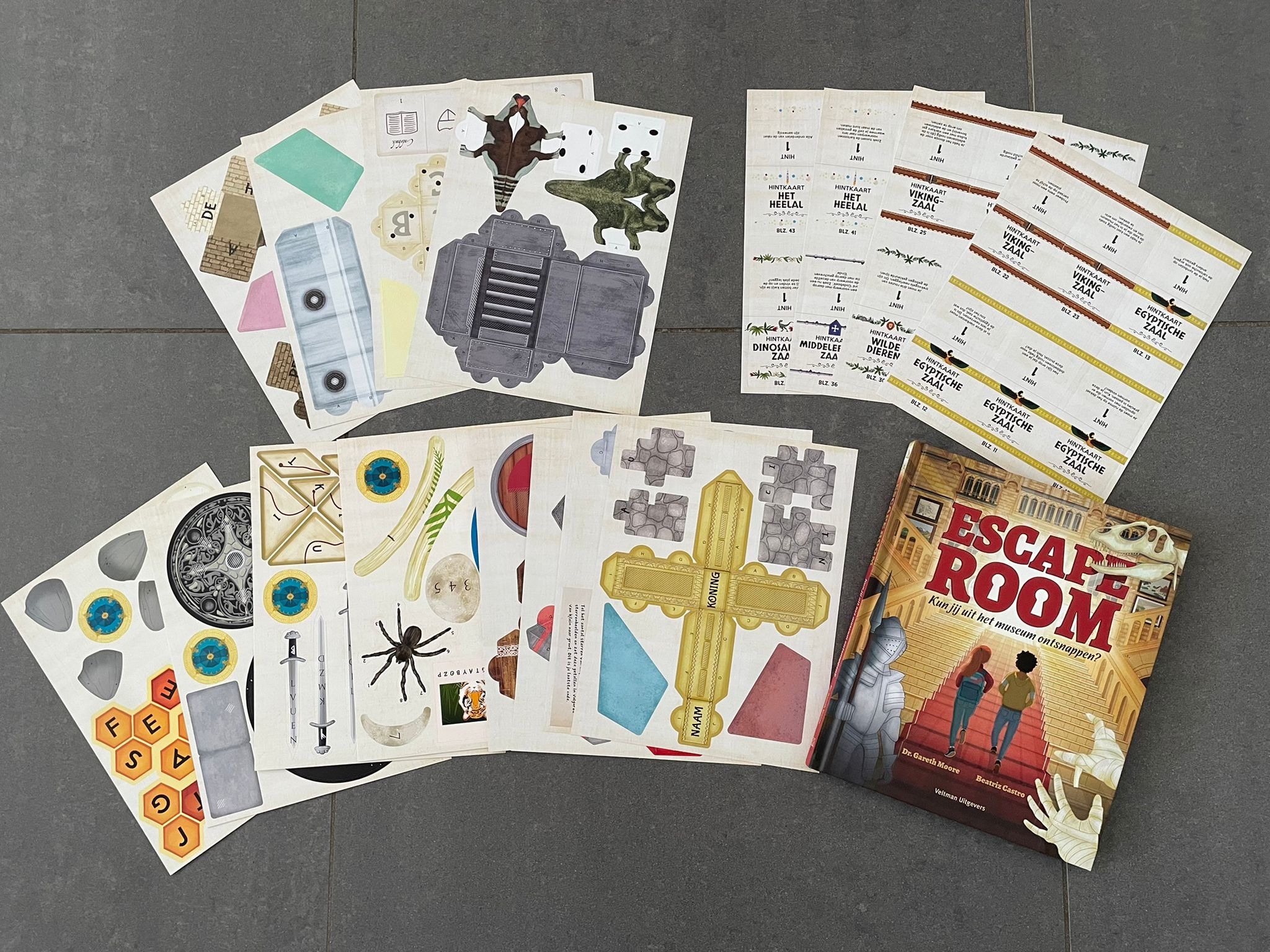 ‘Escaperoom’ is een escaperoom voor thuis. Een interactief puzzelboek met achterin een envelop vol met voorwerpen om uit te drukken en in elkaar te zetten. Je moet zelf proberen te bedenken welke van die voorwerpen je nodig hebt om de aanwijzingen te ontcijferen. Als je de puzzels oplost, kom je steeds verder in het museum. Er zijn 6 verschillende zalen in het museum, en in elke zaal moet je 4 puzzels oplossen. Dat maakt dit boek meteen ontzettend origineel, het is meer dan gewoon een puzzelboekje. Er zijn meer dan 30 items om uit te drukken en in elkaar te zetten, en alleen dat zorgde bij mijn dochter al voor enorm veel plezier.
