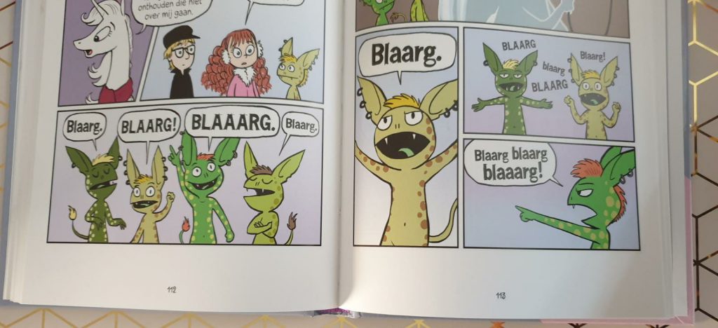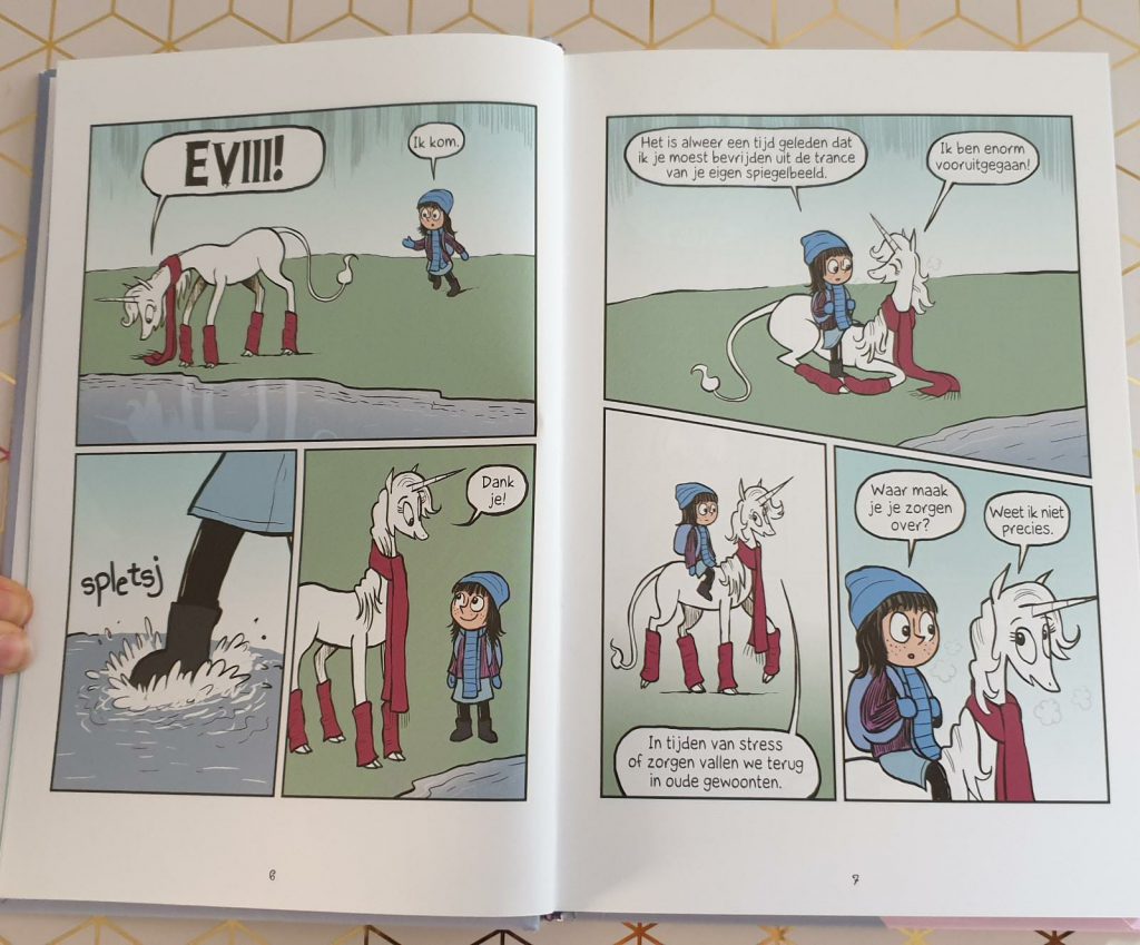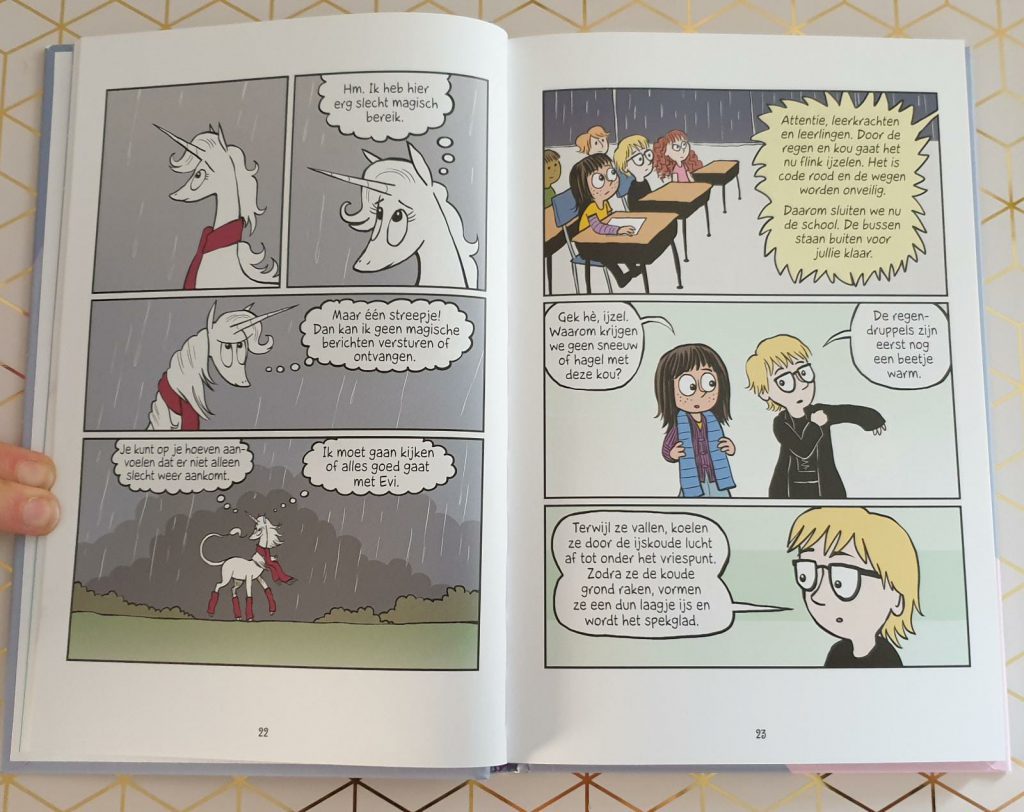 Deze graphic novel is een favoriet bij ons thuis want de avonturen zijn altijd vol humor beschreven. Dit deel is geschreven als 1 verhaal, waarbij er toch tussendoor weer veel andere dingen gebeuren. Want wat moet je nou als er geen internet meer is en eenhoorns reservemagie opraakt?