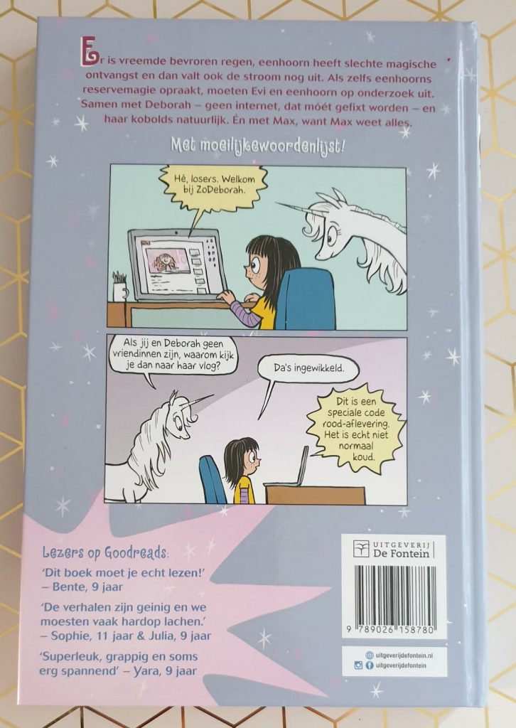Als de stroom uitvalt en zelfs eenhoorns reservemagie opraakt, moeten Evi en eenhoorn op onderzoek uit. Samen met Deborah en haar kobolden natuurlijk, én met Max. Basisschoolproblemen en de worsteling om jezelf te zijn, vermengd met narcisme (eenhoorn), sarcasme (Evi) en een vleugje magie. Deze serie is smullen voor heel veel leeftijden.