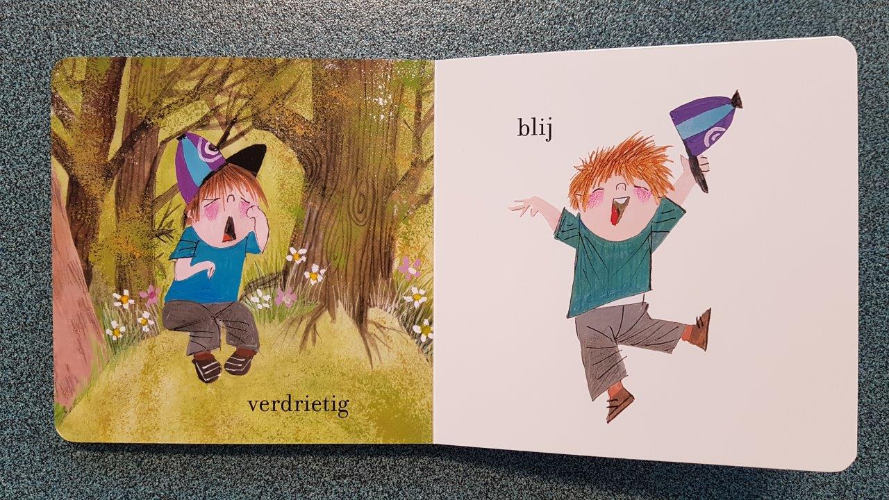 In Fiep in Tegenstellingen komen nog meer tegenstellingen voor zoals de tegenstelling verdrietig en blij. Die kent mijn zoontje op dit moment als boos en blij. De afgelopen maanden begon meneer namelijk zijn eigen wil te tonen voor wat betreft zijn avondeten. Groot gelijk natuurlijk dat hij dit doet, want ik heb zelf ook niet altijd overal evenveel zin in. Hij kan dat alleen nog niet in woorden uitdrukken, dus deed hij dat door de lepel weg te duwen en “Jee” (= Nee) te zeggen. Met als gevolg dat het eten soms overal te vinden was, behalve op de plek waar het door mij gewenst was.