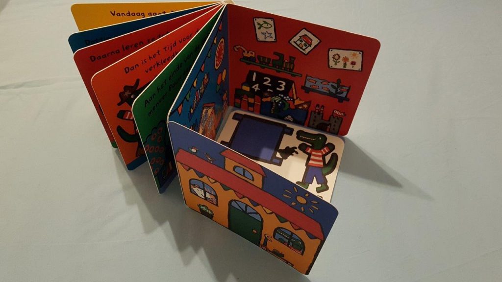 De figuurtjes en het meubilair zijn voorgesneden in dun karton. En deze kun je er voorzichtig uit drukken zodat het kind kan spelen in de crèche van dit pop-up boek. Dit speelgedeelte zou ook zomaar het decor van een kleuterklas kunnen zijn. Het deed mij een beetje denken aan de basisschool. Ik denk doordat er een alfabet en een klok aan de muur hangt.