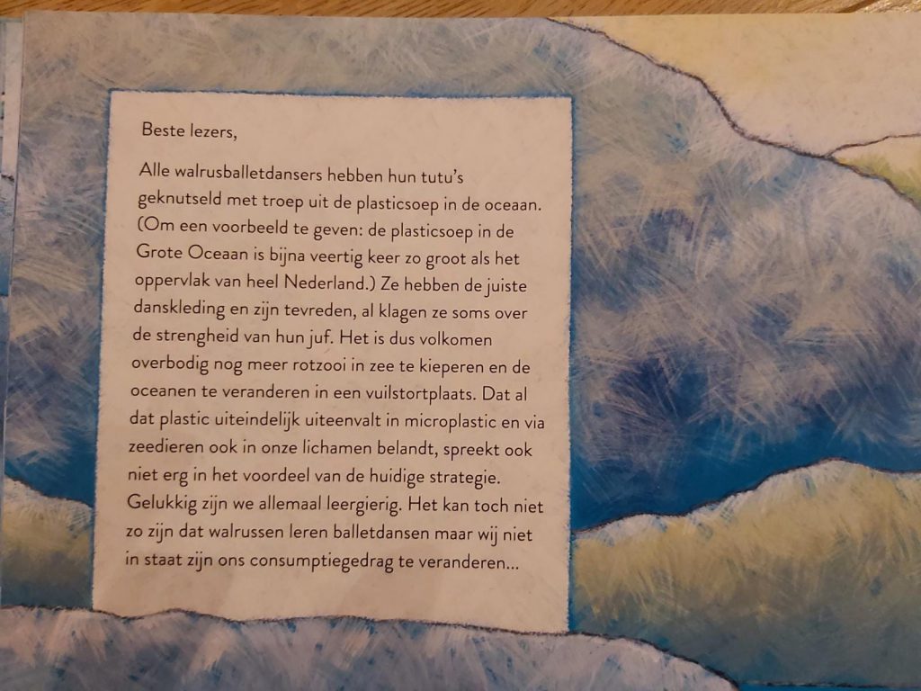 Boeken die het klimaat aankaarten en de plasticsoep zijn echt wel boeken die ik toejuich, maar als ik het van tevoren niet weet valt dit mij toch wel tegen. Tijdens het lezen van Frans Ferdinand wil dansen wordt je regelmatig erop gewezen dat wij de aarde aan het verwaarlozen zijn. Uhm, niet iets wat ik wilde. Ik wilde gewoon een boek over een walrus die uiteindelijk balletdanser wordt. Gewoon simpel lezen zonder dat ik mijn kinderen erop wijs dat we niet goed voor de aarde zorgen. Nu moest ik dit aan mijn kinderen uitleggen waarom het warmer wordt en er plastic in de zee ligt. Daarvoor had ik dit prentenboek niet gekozen. Ik vind dat je dit als schrijver duidelijk moet vermelden zodat je niet voor verrassingen komt te staan.