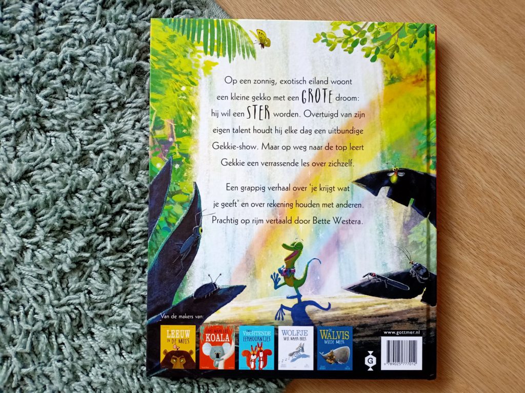 Dit bestsellersduo kennen we van Twee vechtende eekhoorntjes, De walvis wilde meer, De leeuw in de muis, Laat maar los Koala, en Wolfje wil naar huis. De best-wel-belangrijke lessen die ze willen vertellen zijn verpakt is een kleurrijk jasjes. Daarnaast worden deze lessen op swingend rijm verteld. De hoofdpersonen die ze van over de hele wereld uit het dierenrijk plukken zijn nooit te beroerd om te leren en te groeien. Super om je kinderen dit zo in een geweldig verhaal mee te geven. Gekkie de Gekko is precies als de andere boeken. Kleurrijk met een best-wel-belangrijke les.