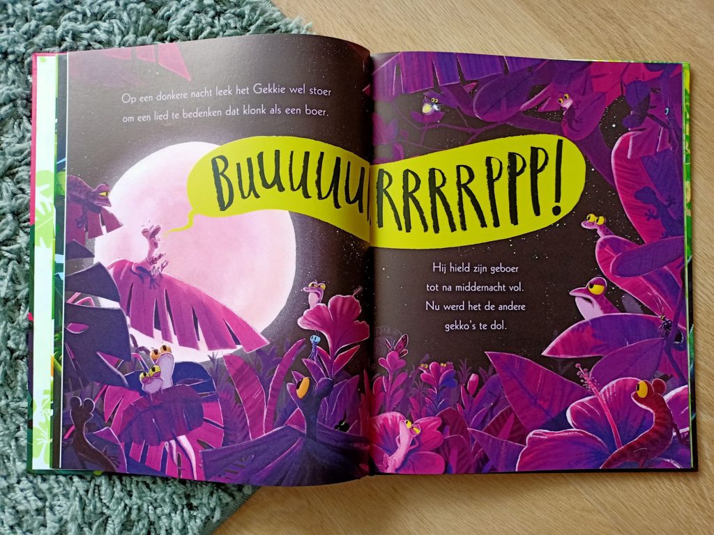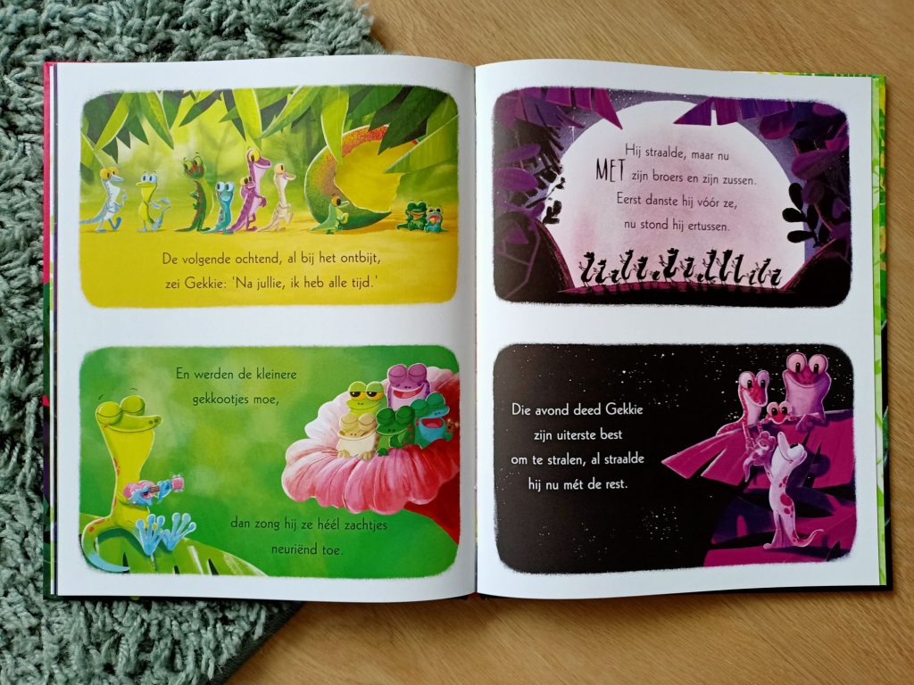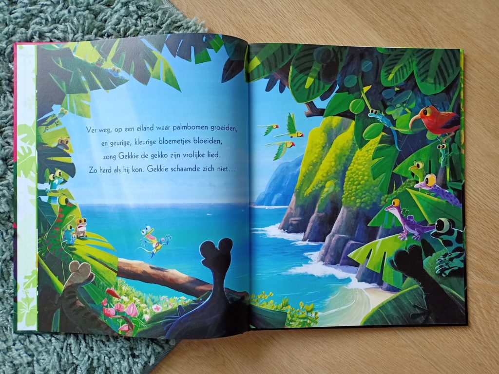 De illustraties in Gekkie de Gekko zijn kleurrijk en sprekend. Er is veel te zien en om over te praten. Vertel als ouder ook wat je ziet of vraag het aan je kind(eren). Super leuk om over door te kletsen samen. Dit verhaal heeft een moraal, iets wat het wil vertellen/leren. Dat wordt op een leuke manier gedaan, waardoor kinderen het niet merken. Het allerleukste van leren is zo leren dat je niet door hebt dat je aan het leren bent. Want moeten leren is stom en saai. Iets spelend, of in dit geval lezend, leren is juist heel leuk.