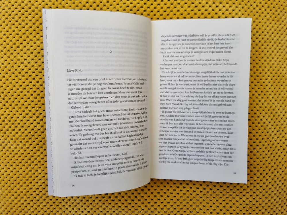 De brieven die Jochem naar Kiki stuurt, in het begin van het boek, vond ik erg mooi beschreven. Dit gaf op een levendige manier een beeld van zijn gedachtes en perspectief op de situatie met zijn ex.