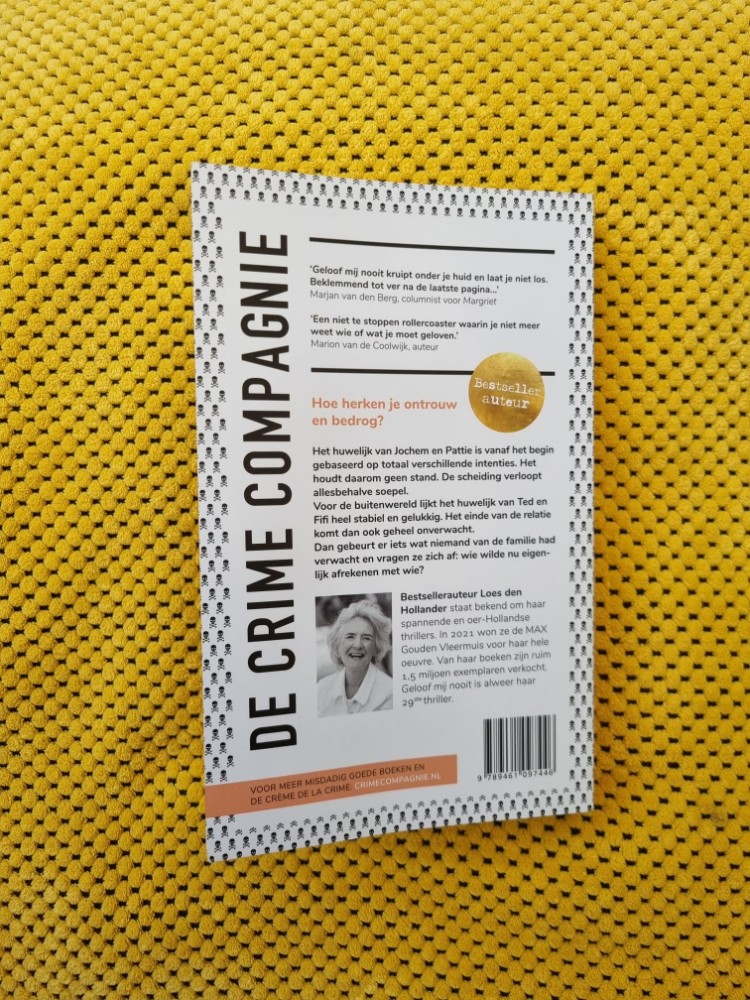 Geloof mij nooit lag al een tijdje op mij te wachten. Ik heb dit boek bewust bewaard voor een weekendje op onze camping. De boeken van Loes den Hollander vind ik namelijk echt zeer geschikt om te lezen tijdens een weekendje weg. Na De heks in mij kon ik niet wachten op haar volgende boek. Ik was dus heel blij dat ik ook die mocht ontvangen van de Crime Compagnie. Heerlijk in het zonnetje heb ik kunnen genieten van deze fijne thriller. Graag vertel ik jullie er meer over. Laat ik beginnen met de prachtige cover!