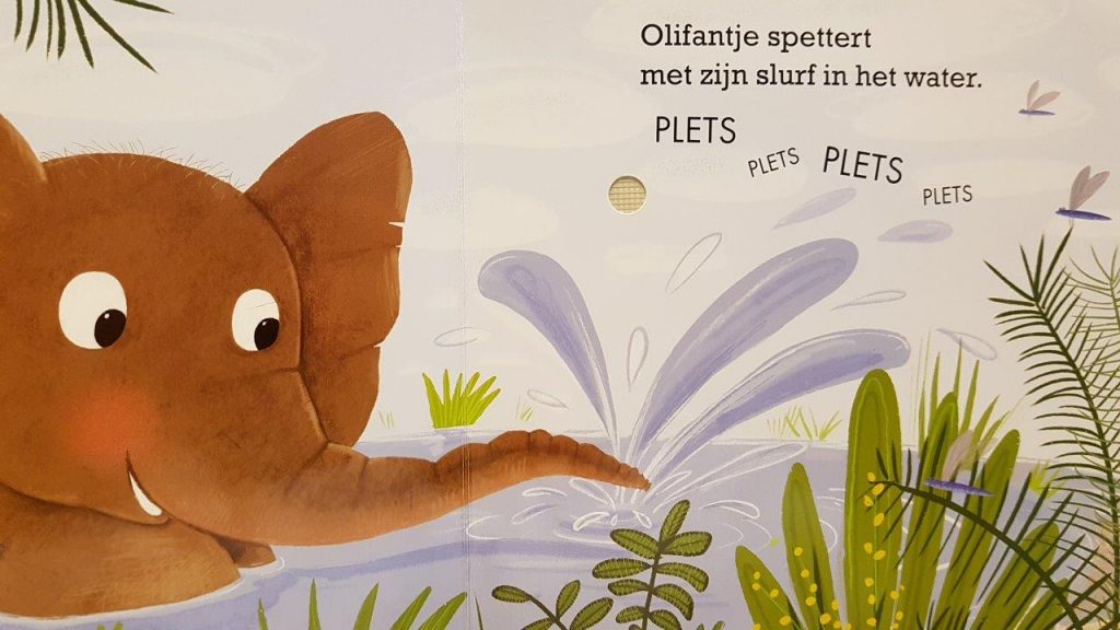 Het leuke van deze geluidenboekjes is de combinatie dieren en muziek. Een leeuw die glimlachend met stokjes op een boomstam zit te tikken is leuk, maar wanneer de olifant laat zien dat je ook muziek kunt maken door op het water te spetteren dat is natuurlijk helemaal geweldig. Zeker als je na het lezen hiervan als 2,5 jarige in bad moet… Dat werd een bad vol muziek kan ik je vertellen!