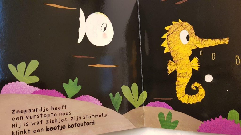 Heel leuk gedaan, de geluiden van deze waterdieren. Zoals de fluitende dolfijn, de brommende schildpad, de neuriënde zee-egel en het zeepaardje met zijn verstopte neus. Haha, het lijkt wel of ze écht zijn! Het hoogtepunt is natuurlijk het waterorgel van de zeester. Dat knopje van het geluidenboekjes drukte mijn zoontje geloof ik wel 10x achter elkaar in.