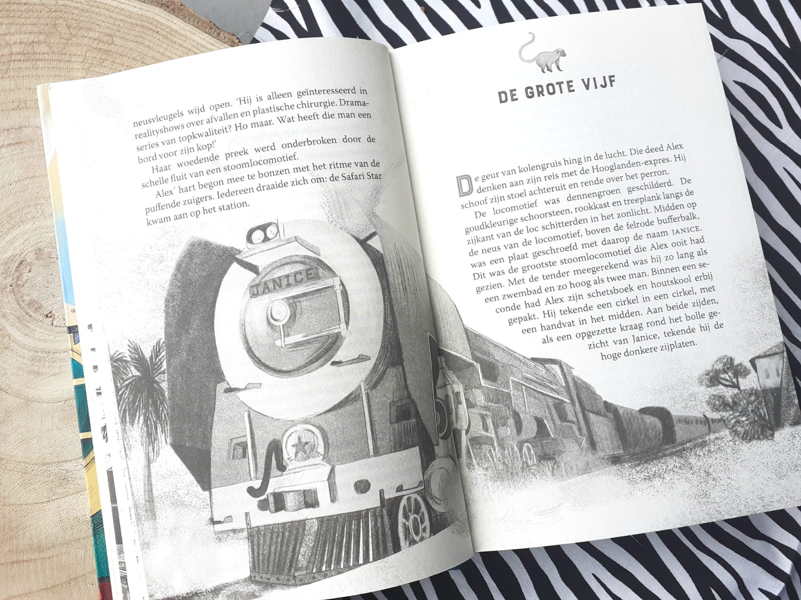 Een spannend en mysterieus verhaal ontvouwt zich. En dat tegen de achtergrond van een safari in Afrika. De groep komt dichtbij olifanten, leeuwen en giftige zwarte mamba’s. En dat maakt dit verhaal heel vermakelijk, spannend en afwisselend. Met veel leuke illustraties van Elisa Paganelli, die het verhaal extra diepgang geven. Zo wordt de trein bijvoorbeeld heel mooi geïllustreerd, maar ook de Afrikaanse wilde dieren. En handig dat er een tekening is van alle passagiers met naam! De ontknoping is heel verrassend, zoals natuurlijk ook wel bij een echt moordmysterie past.