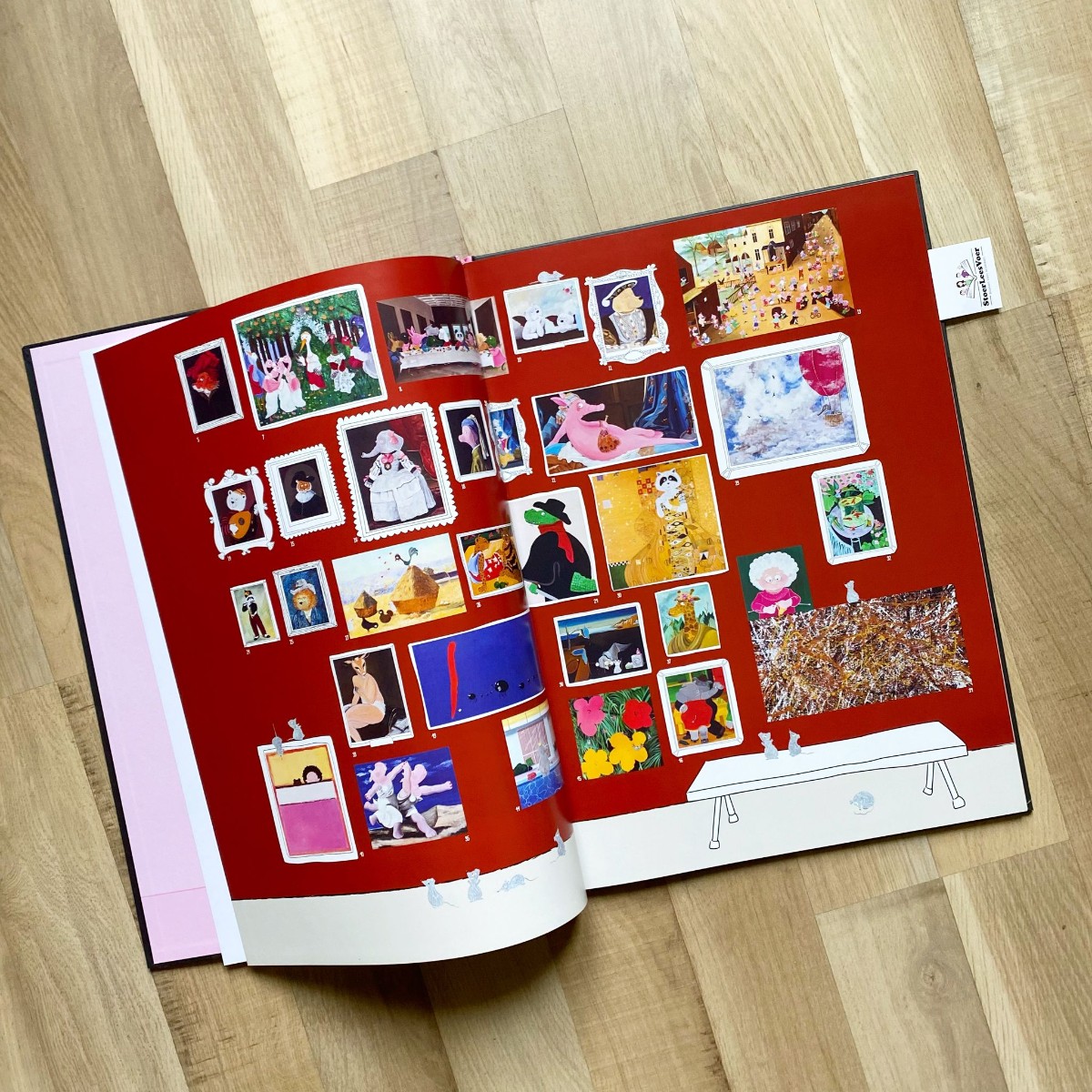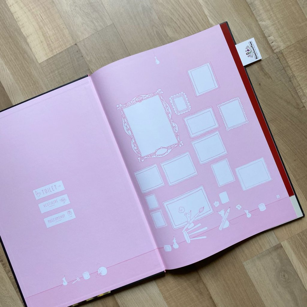 Ik ben groot liefhebbers van schutbladen en om deze vervolgens in te zetten als onderdeel van de beleving van een boek. Bij Grote kunst voor kleine kenners: Museumschatten kan ik mijn hart ophalen. In vrolijk roze hangen er allemaal lege schilderijen. Mijn dochters snappen meteen de bedoeling, kinderen worden door Vanderheyden aangemoedigd tot het vullen van deze schilderijen. Ze mogen hun eigen kunst toevoegen in een ‘echt’ boek. Links hangen bordjes zoals in een echt museum met de weg naar het toilet, museumshop en vestiaire. De wat? Vanderheyden is van Belgische afkomst, en daarmee wordt garderobe bedoelt. Mijn dochters vinden het een prachtig woord, dus onze vocabulaire is ook meteen verrijkt.
