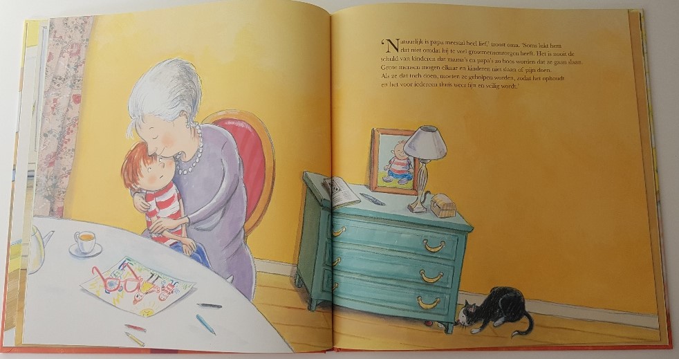 Luuk vertelt tijdens etenstijd hoe leuk zijn dag was. Ondertussen schept zijn vader grote lepels met eten op zijn bord. Luuk zegt dat hij dat niet op krijgt en zijn vader wordt heel boos. Hij gooit de lepel in de pan, slaat met zijn vuist op tafel en roept boos dat Luuk voor straf na het eten naar zijn kamer moet. Luuk schrikt er zo van dat hij zijn water ook nog omgooit.. Dat is het begin van Grote mensen mogen ook niet slaan. Nog maar 2 pagina’s gelezen en ik heb al een verkrampte maag. Arme Luuk!