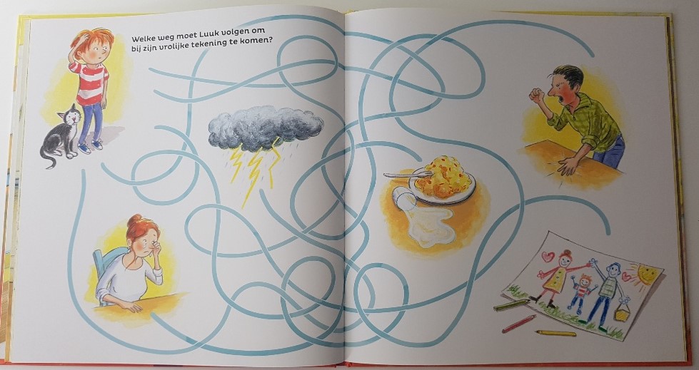 Oma heeft een goed idee. Ze laat Luuk een verdiettekening maken over dat gene waar hij zo’n verdriet over heeft. We zien een illustratie van een boze papa die helemaal rood is aangelopen en bliksemschichten. We zien een huilende mama met een zwart oog en een huilend kindje.