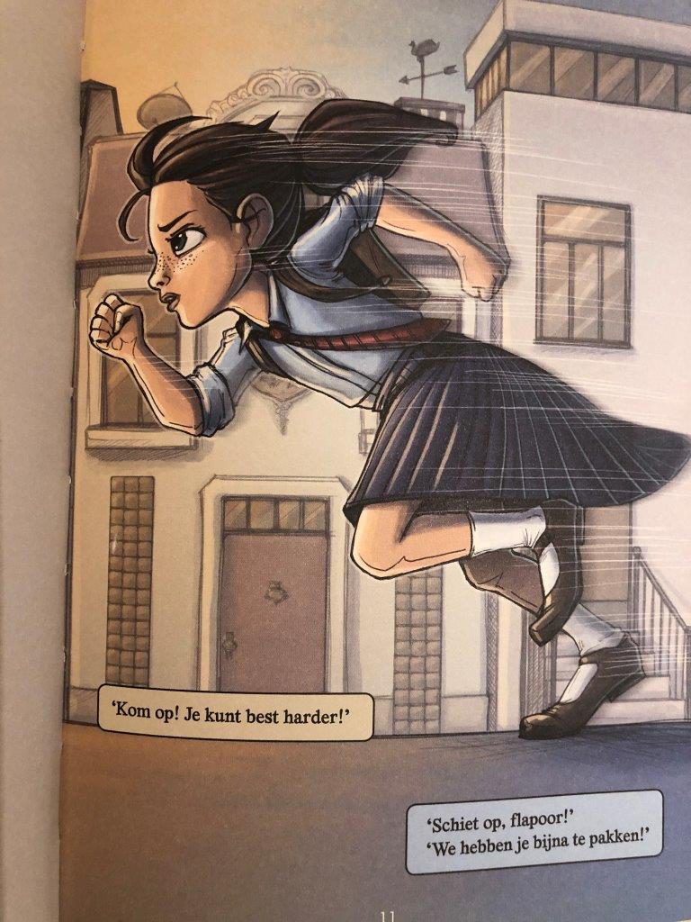 Handboek voor superhelden – Het handboek begint direct met geweldig gekleurde tekeningen. Het is zo mooi getekend dat je alleen daarom al het boek wil gaan lezen. Voordat hoofdstuk 1 begint staat er direct een tekstwolk met de tekst “Je kunt vluchten voor je vijanden. Maar je kunt niet vluchten voor jezelf.” Wat gaat dit boek ons vertellen?.