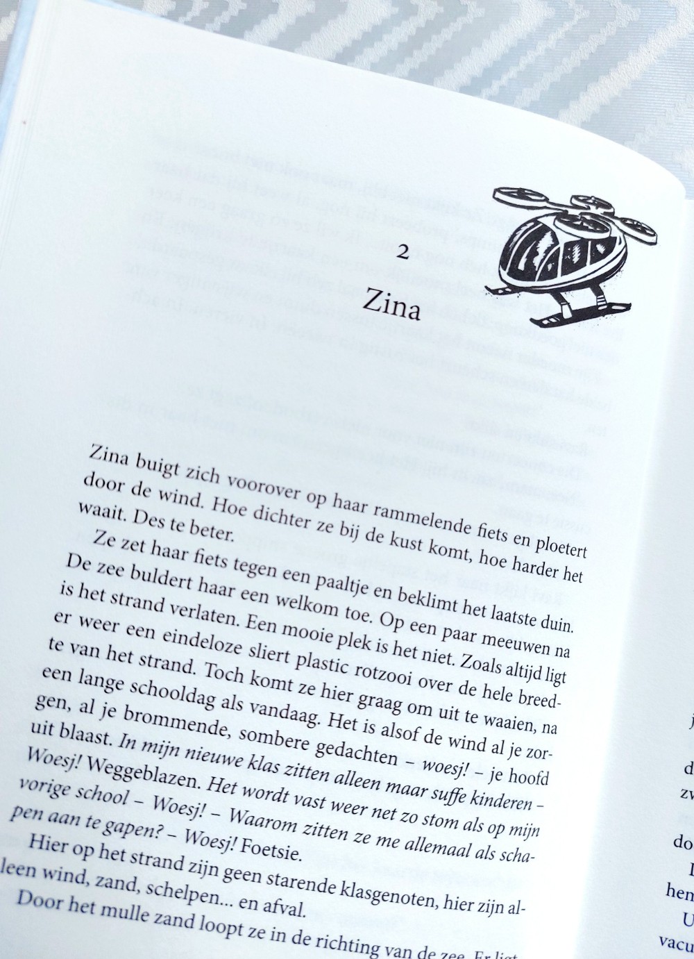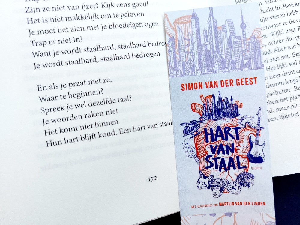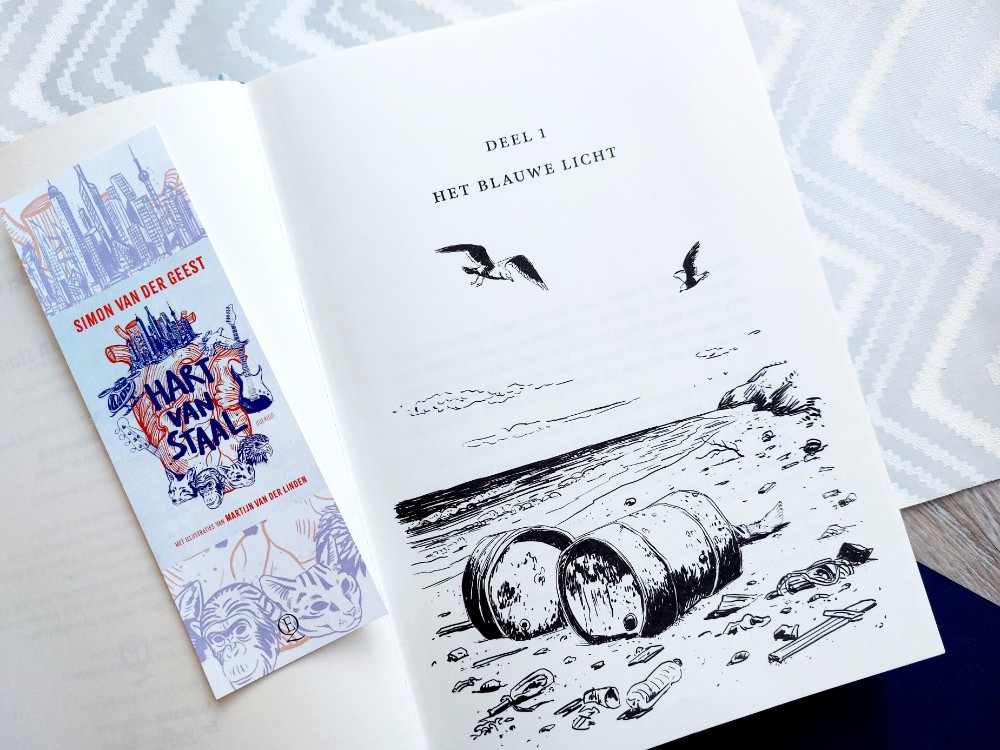 De auteur van Hart van Staal is Simon van der Geest en de zwart-wit illustraties zijn van Martijn van der Linden. Alleen de omslag is al onwijs tof, maar ook in de hoofdstukken zien we kleine illustraties die het verhaal leuk aanvullen. Dit is echt een boek dat een breed publiek kan aanspreken, jongens en meiden vanaf ongeveer 10 jaar. In eigen huis is de 11-jarige ermee begonnen en blij verrast door het onderwerp en de spanning. Een aanrader!