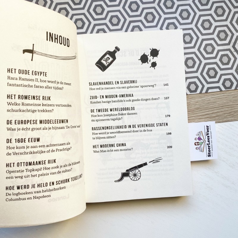 Held of schurk heeft een toffe invalshoek. Want helden en schurken zijn er altijd al geweest. En soms worden helden schurken en vice versa. Soms ligt het aan je perspectief wie een held of schurk is. Het levert boeiende gespreksstof op. Elk hoofdstuk begint met 5 dingen die je moet weten voordat je aan dat deel van de geschiedenis begint. Ernaast staat een overzichtelijke tijdsbalk. Ik had het misschien nog overzichtelijk gevonden als er een blanco pagina met de titel vooraf zou komen. Ik blader graag en zo springen de diverse onderdelen meer in het oog. Maar volgens de inhoudsopgave en paginanummering kom je er ook prima.