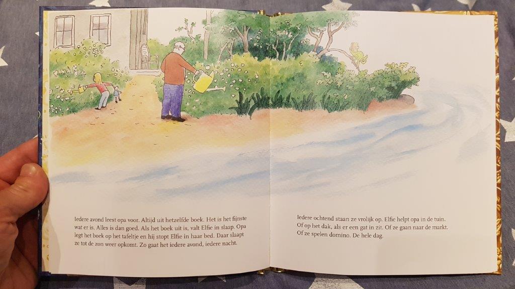 Iedere avond leest opa voor. En altijd uit hetzelfde boek, dat is het fijnste wat er is. Alles is dan goed. Als Het boek van de sterren uit is, valt Elfie in slaap. Zo gaat het iedere avond. Maar deze avond is alles anders, want het boek is weg! Ze zoeken overal en Elfie kan niet slapen. Ze denkt alleen maar aan het boek. Hoe kan opa nu voorlezen?
