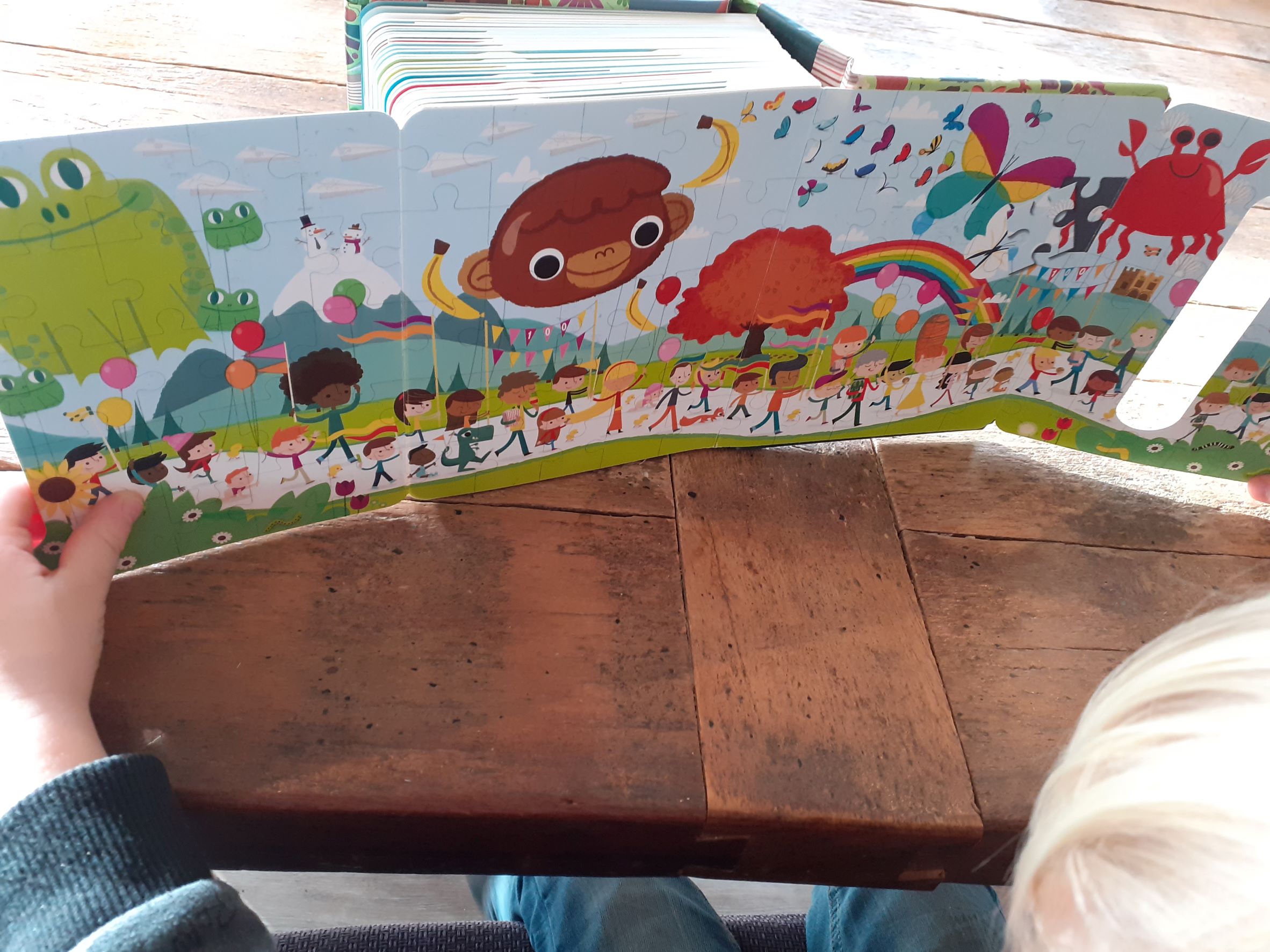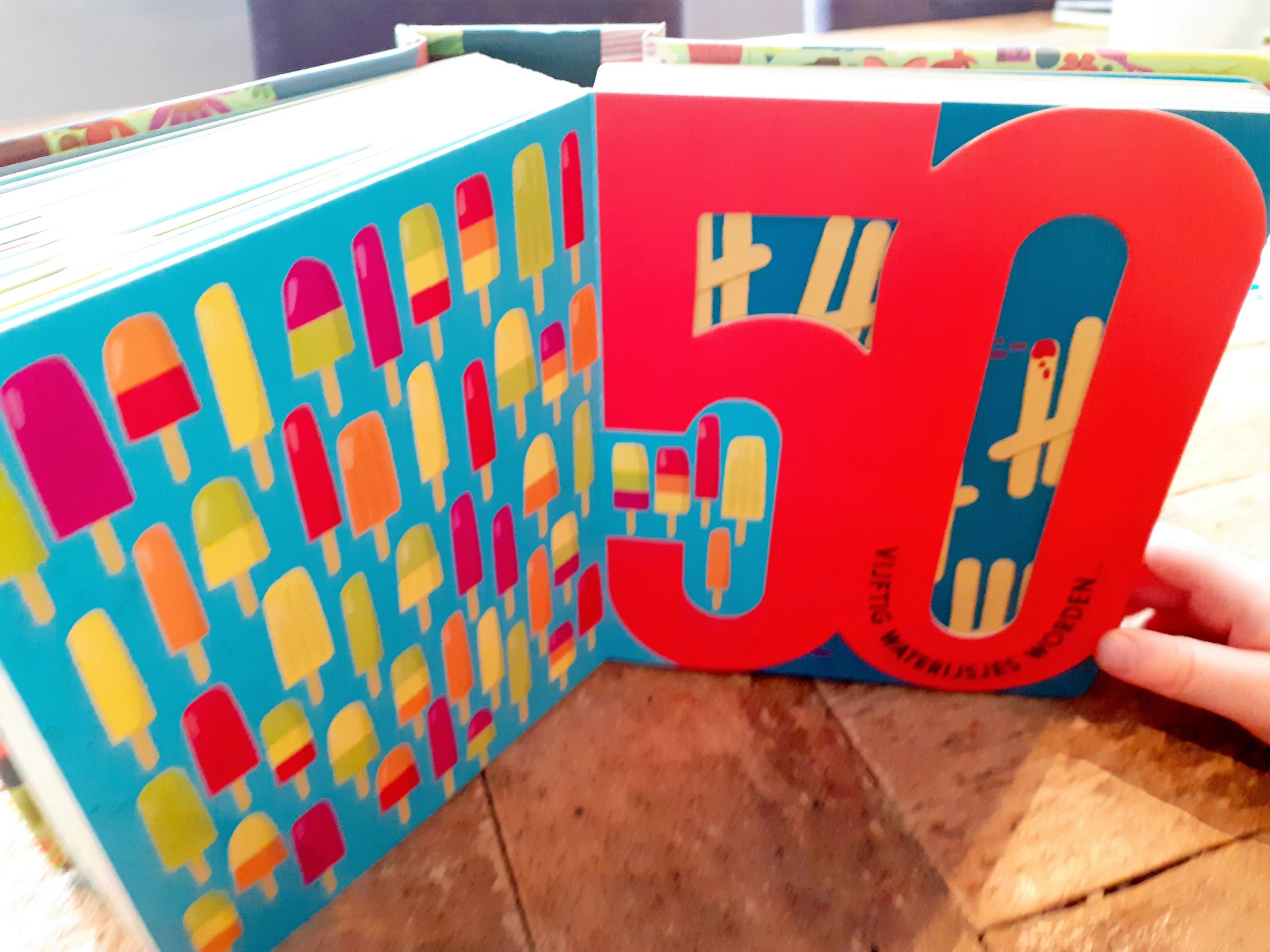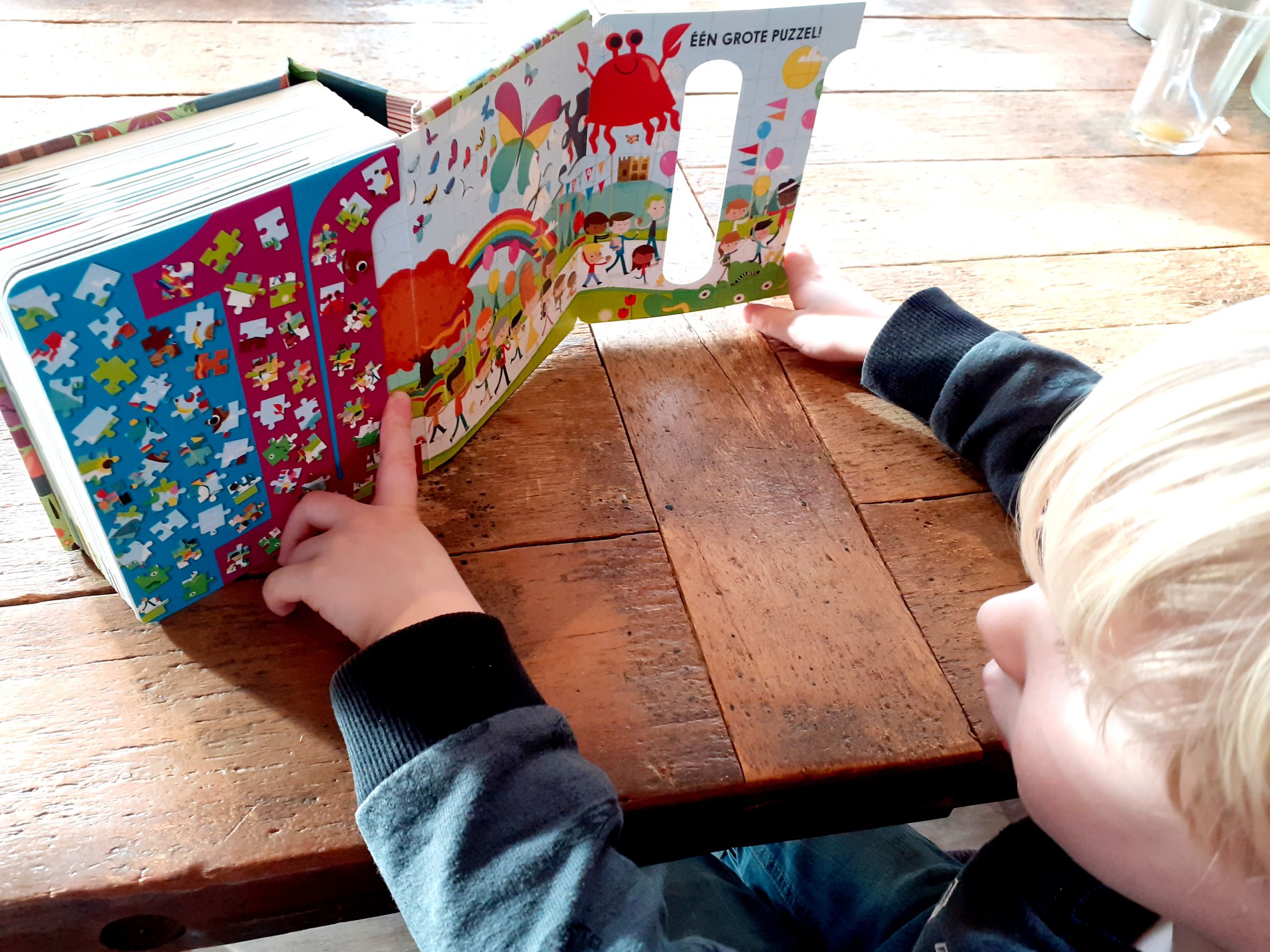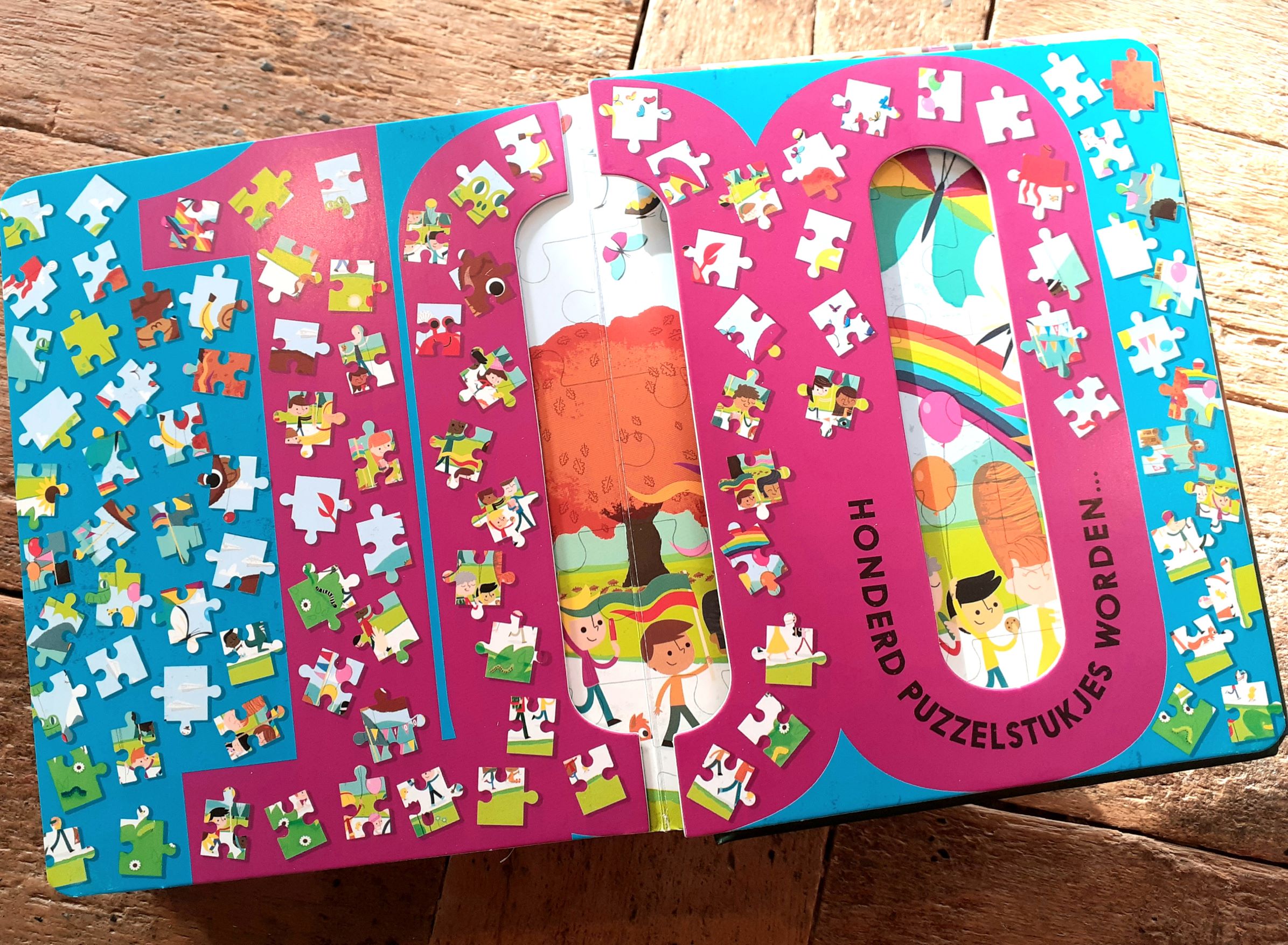 De mooie bladzijde van de 100 is toch wel onze favoriet. Dit is namelijk een uitklappagina met een afbeelding van een grote puzzel. En heel veel kindjes die een kleine optocht houden. En verder in dit boek natuurlijk ook een heleboel dieren. Maar ook ijsjes, snoepjes en koekjes! Genoeg om te bekijken dus in dit dikke telboek.