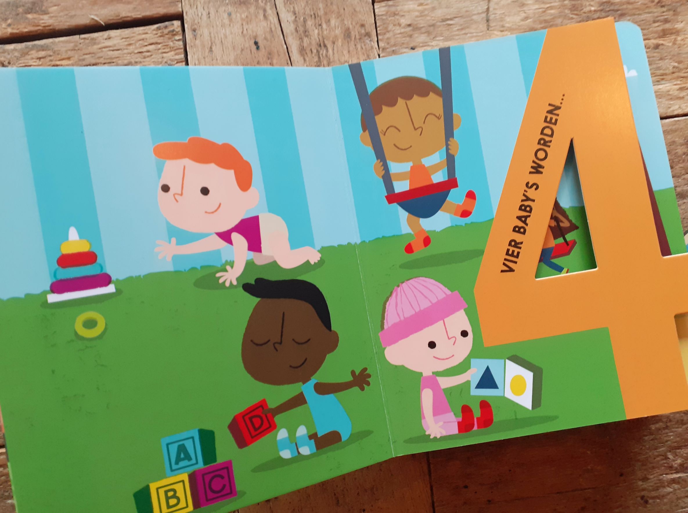 Op elke bladzijde van dit dikke telboek staat een groot cijfer met een klein raadsel. Vier baby’s worden… vier kinderen! Tien emmers zand worden… tien zandkastelen! Na de 10 gaan we dan verder met tientallen. Twintig rupsen worden… twintig vlinders! En zo verder naar 100. Honderd puzzelstukjes worden… 1 grote puzzel! Wat een boel bladzijden met allerlei ontdekkingen.