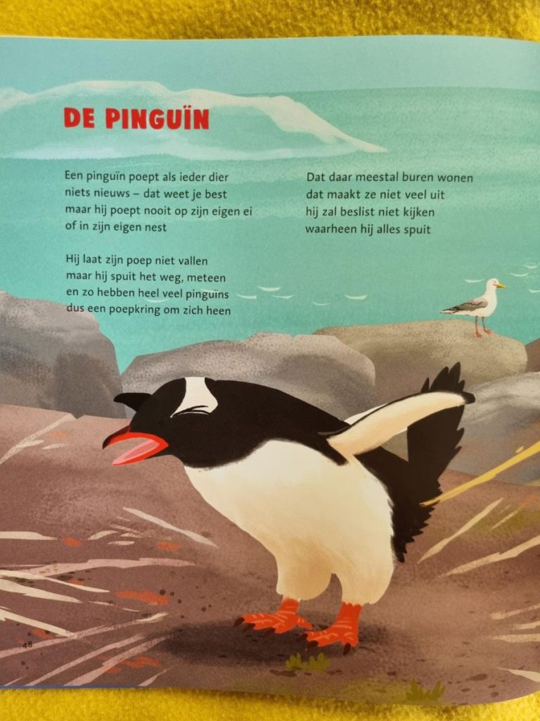 Naast de prachtige illustraties in dit boek is de opzet gestructureerd en speels tegelijk. Elk dier heeft twee bladzijdes gekregen. De eerste bevat een geweldig versje. Dit versje is, zoals gezegd, heel herkenbaar voor de auteurs. Het bevat weetjes over het dier, maar dan met een grappige twist. Ze zijn heel passend bij de leeftijd van de doelgroep, kleuters en middenbouwgroepen. Gemakkelijk qua ritme, zodat ze ook goed af te maken zijn en rijmwoorden geoefend kunnen worden. Daarnaast moet ik zelf regelmatig gniffelen als ik ze lees. Wist jij bijvoorbeeld iets over poepende pinguïns? Ik niet…. maar ik weet wel dat de Pinguïnrots, onze groep 3/4, volgend schooljaar een eerste rijke tekst heeft om te bespreken!