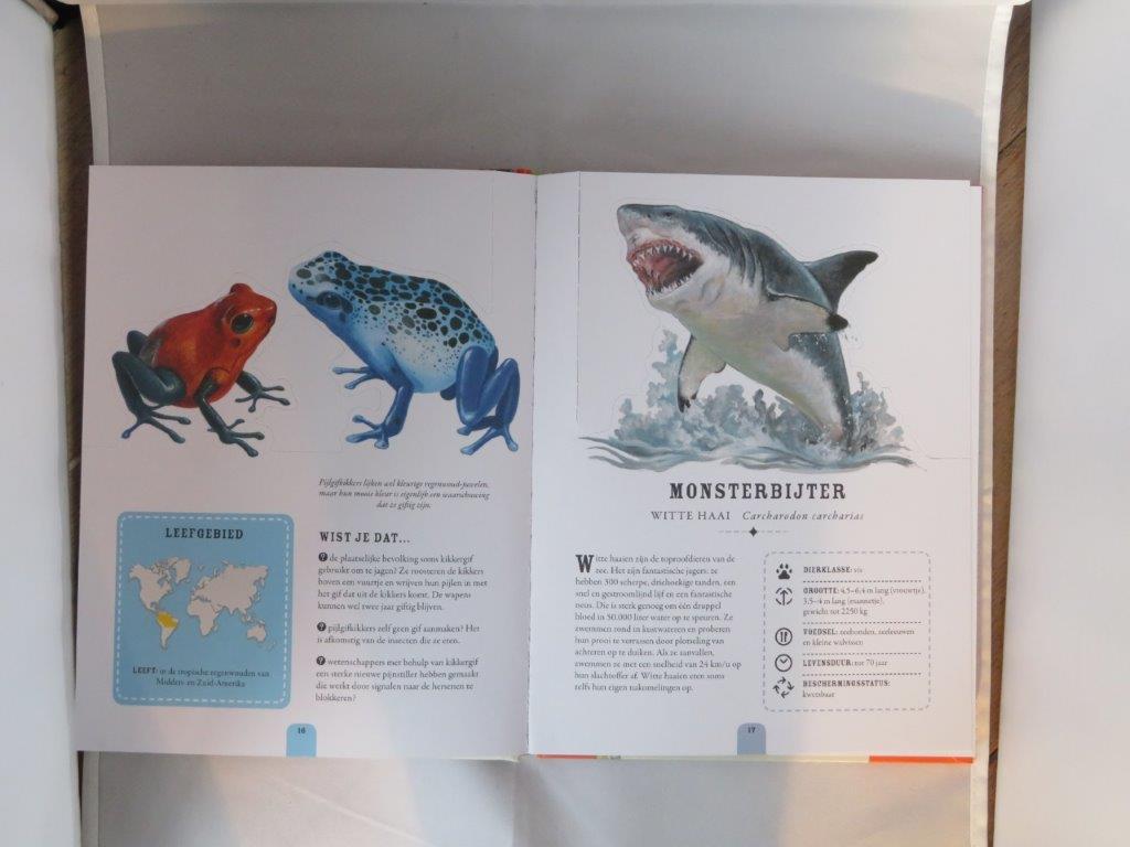 Naast een overzicht van dierklassse, grootte, voedsel, levensduur en beschermingsstatus wordt in het boek het fantastisch mooie Dierenrijk ook aangegeven wat het leefgebied is. En worden 3 wist je datjes weergegeven. Wist je bijvoorbeeld dat luiaards goed kunnen zwemmen en in het water vee lsnelelr bewegen dan op het land? En wist je dat een deel van het menselijk brein ‘hippocampus’heet en op een zeepaardje lijkt? Wat niet specifiek bij de wist je datjes staat, maar wel wordt genoemd is dat babyzeepaardjes tevoorschijn kome nuit de buik van hun vader en meteen voor zichzelf moeten zorgen. Kijk, dat vind ik nou bijzonder en wist ik niet.
