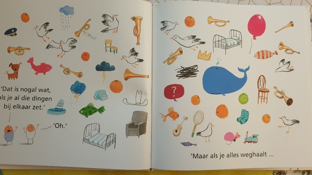 En zo komen we weer even in een algemeen telboek, waarbij kinderen kunnen tellen hoeveel er elke keer een bij is. We tellen stoelen, driftbuien. Sinaasappels die ergens bovenop liggen. We raden met zijn achten wat er er in een pakketje zit ( overduidelijk een teddybeer maar niemand die het raadt haha ). En zo gaan we door tot het getal 10 en alles op 1 pagina bij elkaar is heel veel, maar als je alles weghaalt.