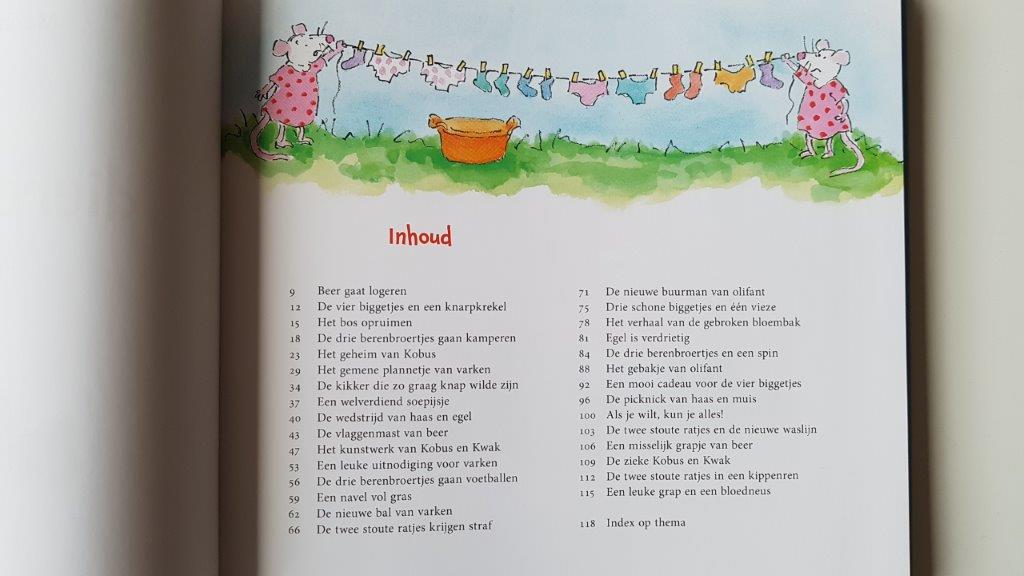 Ik vind Het grote dierenverhalenboek een leuk, vrolijk voorleesboek met levendige beeldende tekeningen. Fijn ook dat er achterin een index op thema staat, want er staan wel dertig verschillende verhalen in Het grote dierenverhalenboek! Dankzij de index kun je dus zoeken op thema. Zodat je je kind kunt voorlezen over een onderwerp waar het op dat moment behoefte aan heeft. Of wat je dan zelf bespreekbaar wilt maken. Daarom lijkt het mij ook een geschikt boek om te gebruiken bij de opvang of op school bijvoorbeeld.