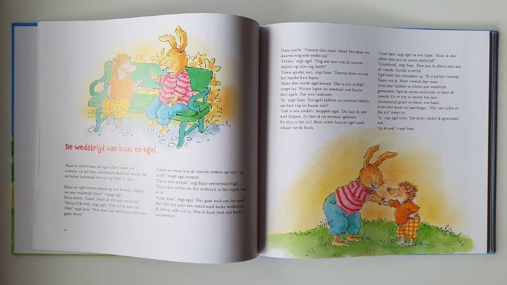 Elk verhaal in is twee tot drie pagina’s lang en gaat over één of meer thema’s. Het verhaal Beer gaat logeren bevat bijvoorbeeld de thema’s doorzetten, opgeruimd staat netjes en trots zijn op jezelf. En De wedstrijd van haas en egel gaat over het niet tegen je verlies kunnen. Maar omdat elk verhaal in Het grote dierenverhalenboek een nieuwe emotie oproept, is het misschien niet zo handig om meerdere verhalen achter elkaar voor te lezen.