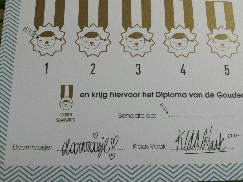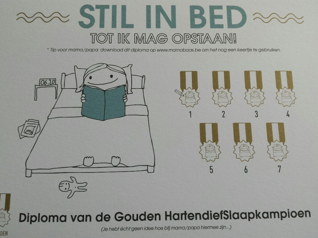 En speciaal voor vroege kindertjes, of voor luie papa’s en mama’s. Er zijn ook diploma’s voor het doorslapen in eigen bed of stil in bed liggen tot ze op mogen staan. Goede aanvulling in het grote diplomaboek.