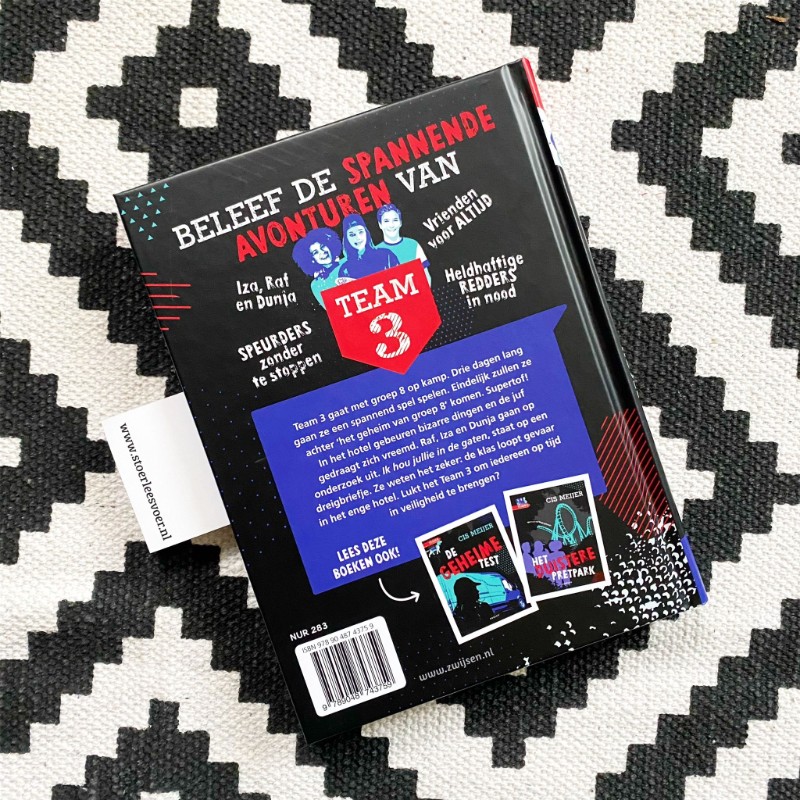 Team 3 is terug voor een nieuw spannend en mysterieus avontuur. Dit is het derde deel uit de spannende jeugdserie geschreven door Cis Meijer. De boekenserie is geschikt voor lezers van 9-12 jaar. In dit deel gaan we op schoolkamp met onze vrienden Iza, Raf en Dunja. Een schoolkamp waar iedereen naar uitkijkt, want ze gaan daar ‘Het geheim van groep 8’ leren… Maar er gebeuren al snel vreemde dingen in Het gruwelijke hotel.
