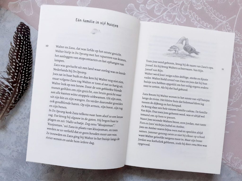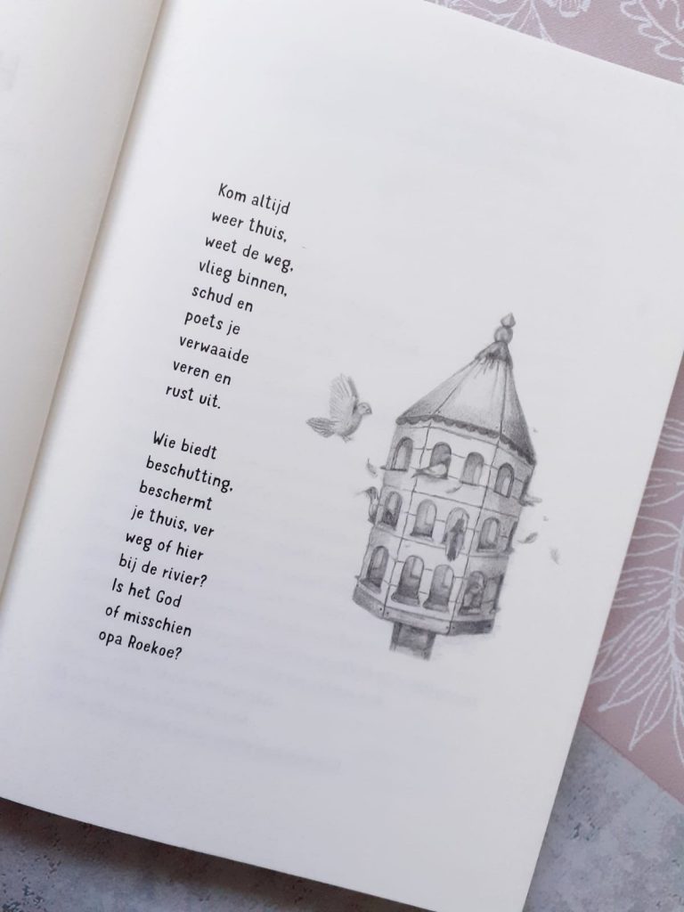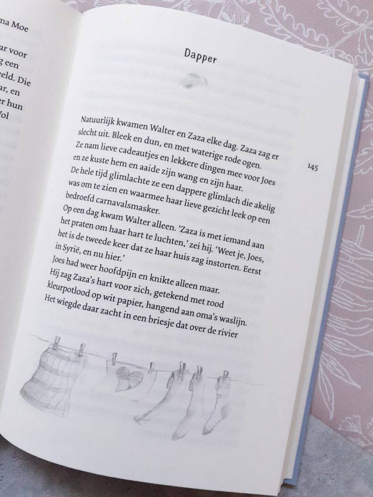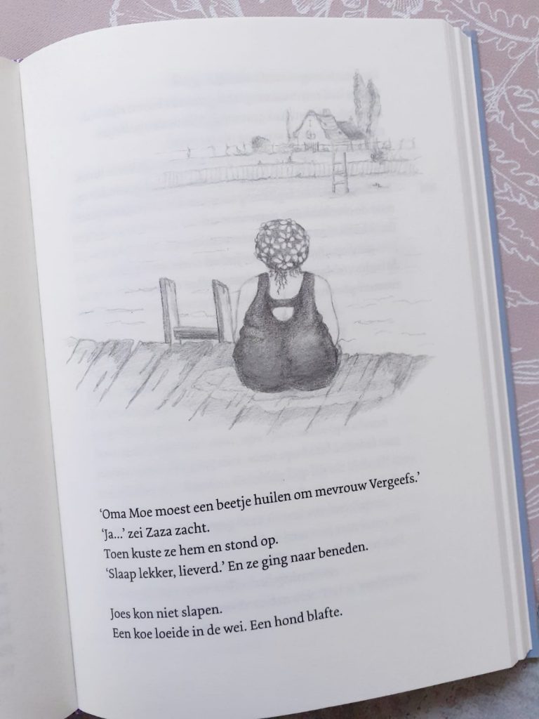 Mooi zijn ook de kleine illustraties van Selma Noort met de kenmerkende onderwerpen van het verhaal. Zoals de duiven en kippen van Opa Roekoe, de waslijn en de steiger. Mooi en sfeervol!