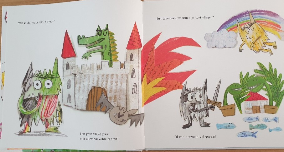 De illustraties in het kleurenmonster gaat naar school vind ik altijd heel erg bijzonder. Het is een groot knutselproject geweest met krijtjes, karton, papier, verf en lijm. Heerlijk om op die manier te illustreren lijkt mij dat. Lekker grof en heerlijk herkenbaar voor kinderen. Het werkt inspirerend om bij dit boek een hoek in te richten waarbij kinderen ook worden uitgenodigd een knutsel te gaan maken. Misschien over emoties, of over hun slaapkamer bijvoorbeeld.