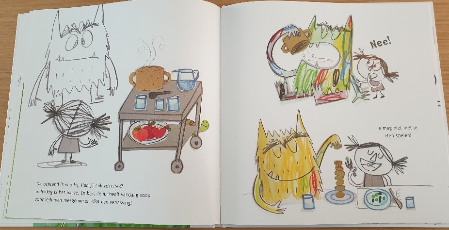 Maar is kleurenmonster wel aan het delen? En weet hij zich wel te gedragen op het toilet? Na de overblijf is het kleurenmonster zo moe dat hij even naar de peuters gaat voor een middagdutje. Heerlijk herkenbaar is dat voor mij als kleuterjuf. Wij hebben dan ook 2 matrasjes in de klas voor als er kinderen soms even behoefte hebben aan een dutje.