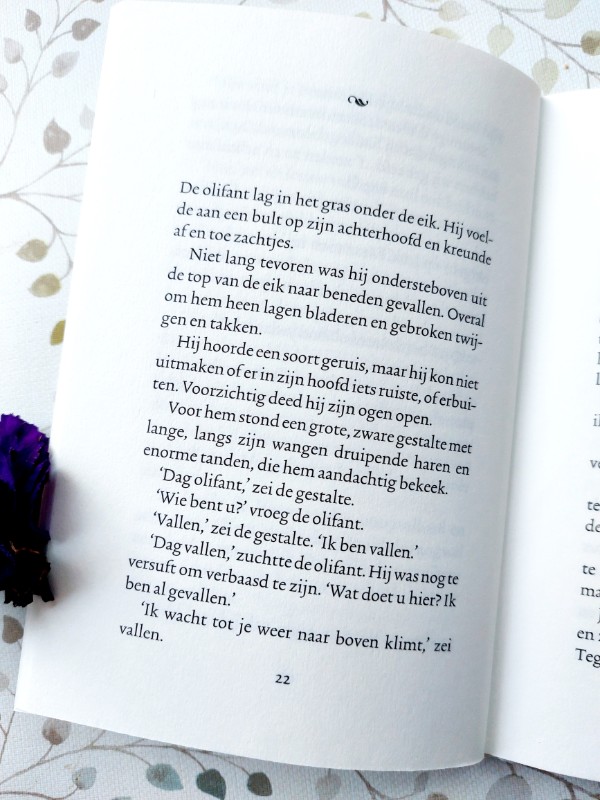 Zo is er de olifant met zijn kunstige pirouettes hoog in de boom. Een risicovolle onderneming. Maar vallen is van later zorg! En als je valt, dan komt het ook wel weer goed. Gewoon nog een keer proberen. En misschien ben je wel heel goed in vallen.
